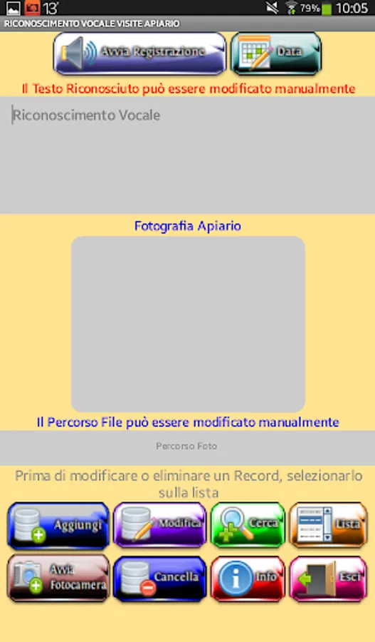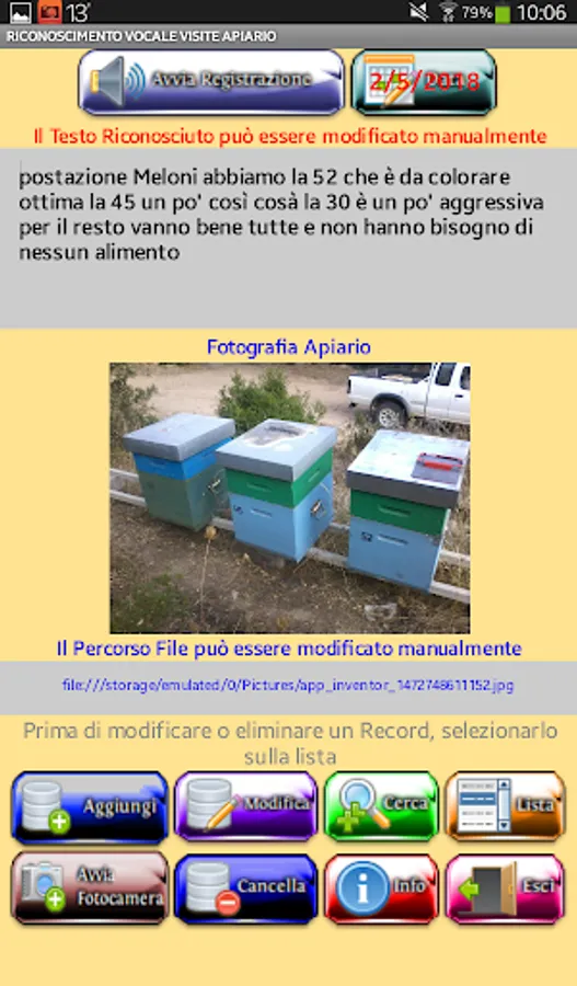 This application has the function of storing data of visits to our apiary, using the voice recognition system of Android, by converting your voice into text.