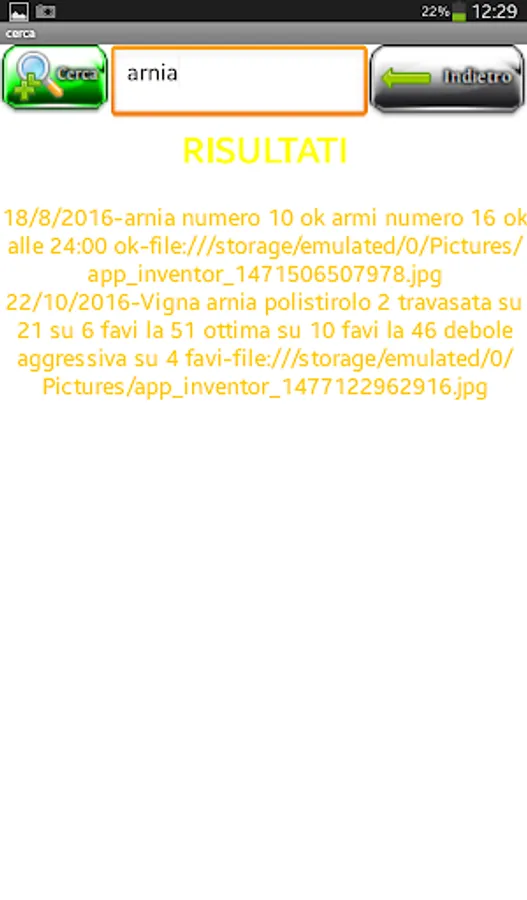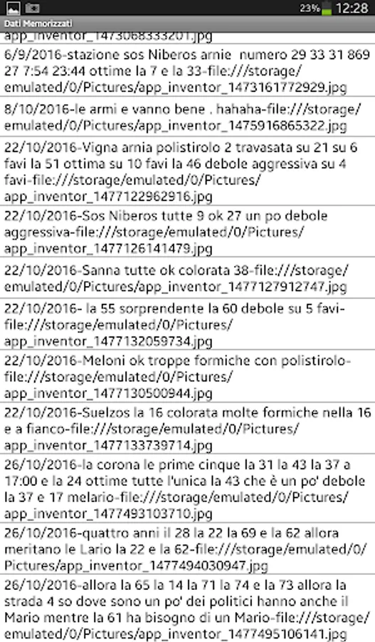 For convenience will always be created a file called Apiary + date + .txt that will be stored on your smartphone or tablet to the root, it can then be opened with any text editor.