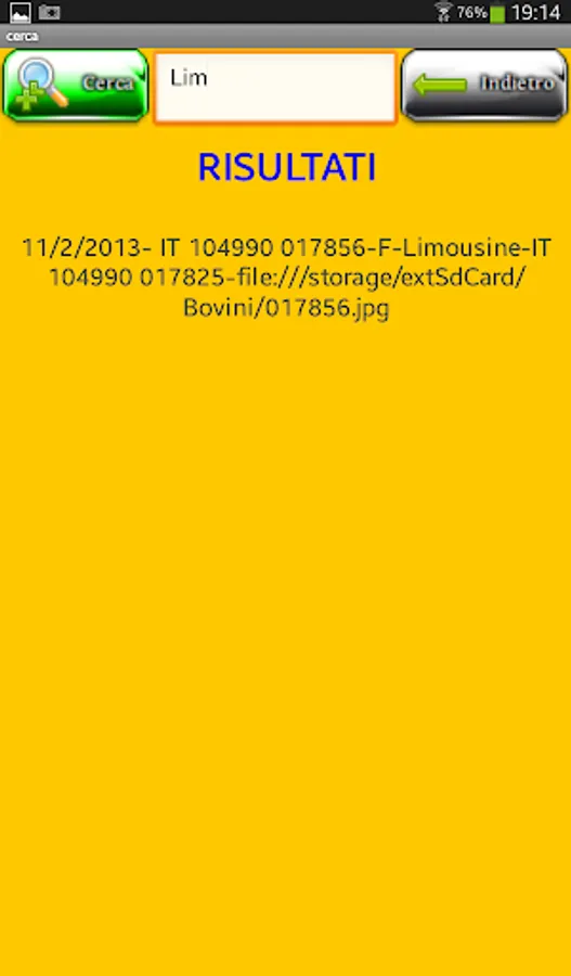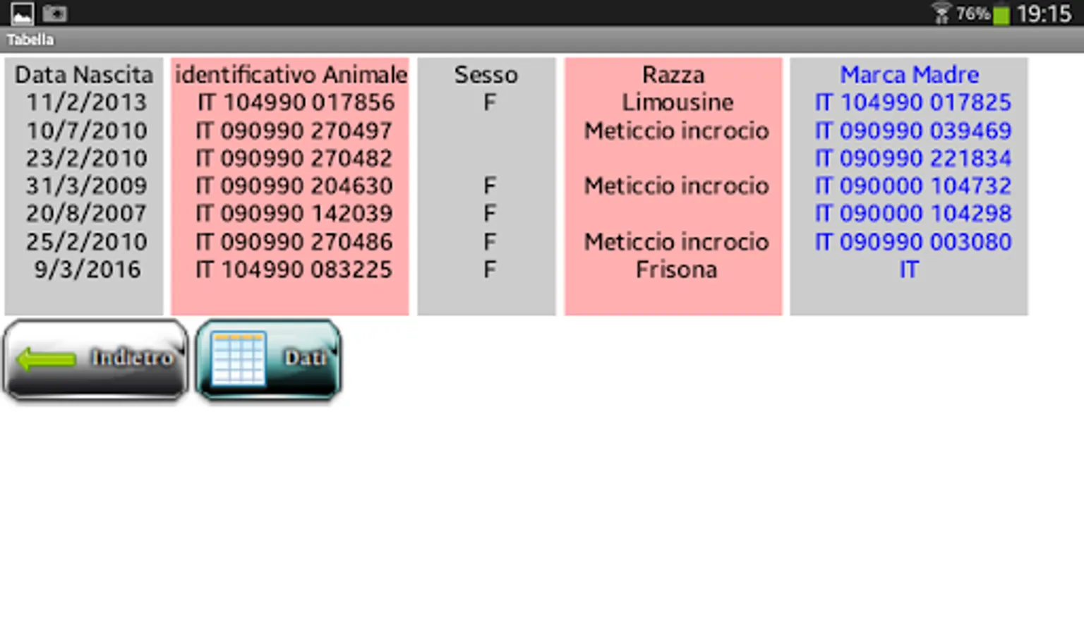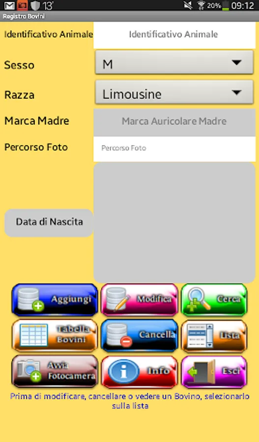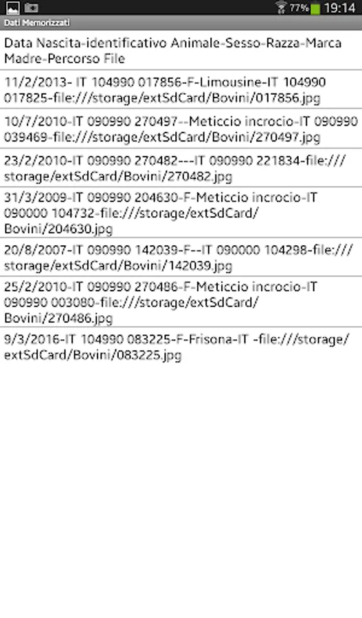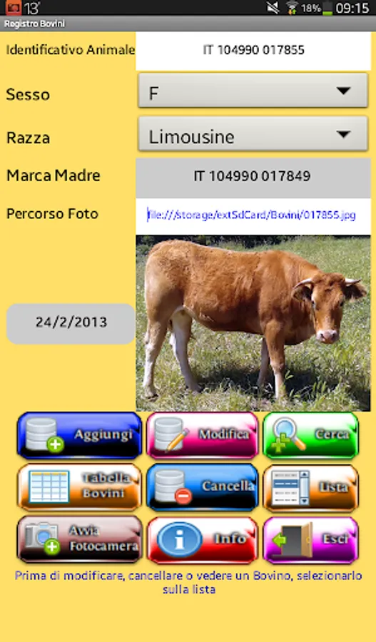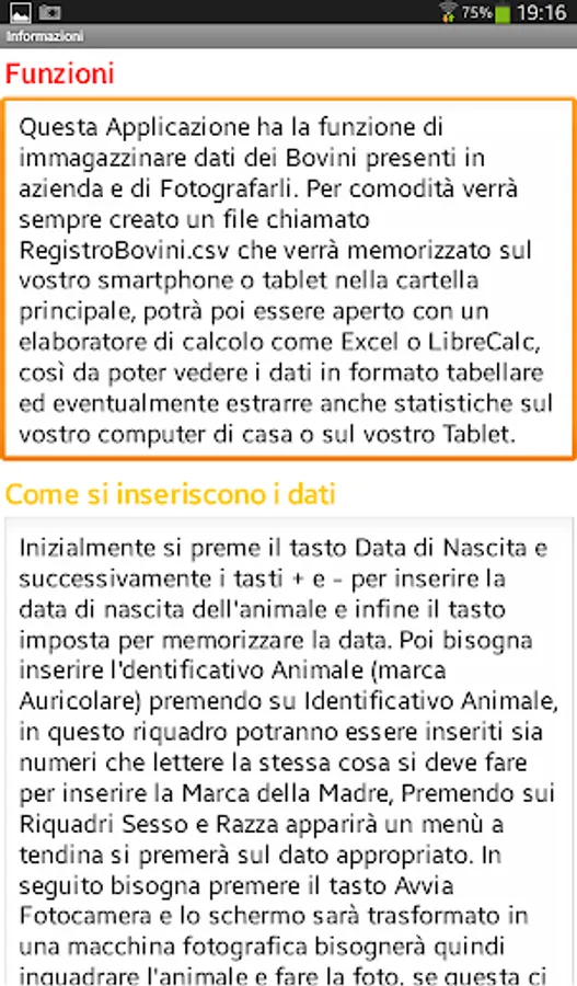 This application has the function of storing data of cattle present on a farm and photogenic. For convenience will always be created a file called RegistroBovini.csv that will be stored on your smartphone or tablet to the root, it can then be opened with a computer program such as Excel or LibreCalc, so you can see the data in a table format and possibly even pull stats on your home computer or your Tablet.