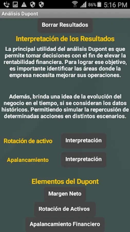 The "Interpret" button shows a standard interpretation of each of the calculations, it should be considered that the interpretation is general knowledge and for educational purposes.