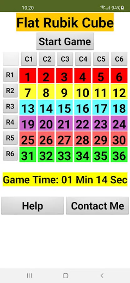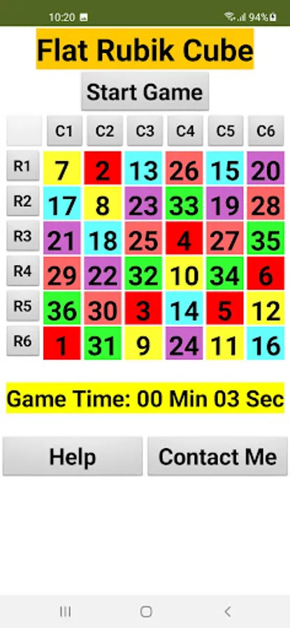 A. A table of 6 rows on 6 columns, 36 cells, numbers from 1 to 36.