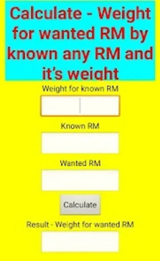 Repetition Maximum (RM) Calculator gives you an estimation weight for any Calculate wanted RM if you know the weight for a certain RM.