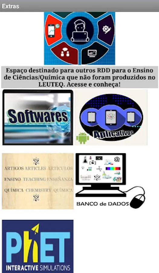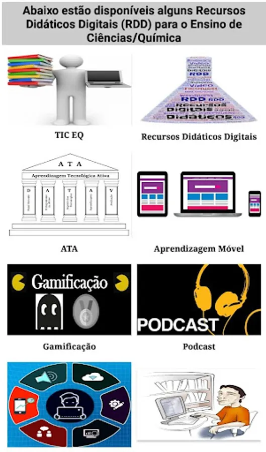 Application for the dissemination of educational materials developed in the LEUTEQ Group and research partners. The app has several Digital Didactic Resources that can be used by teachers and students interested in the use of digital technologies in science teaching, especially in Chemistry Teaching.