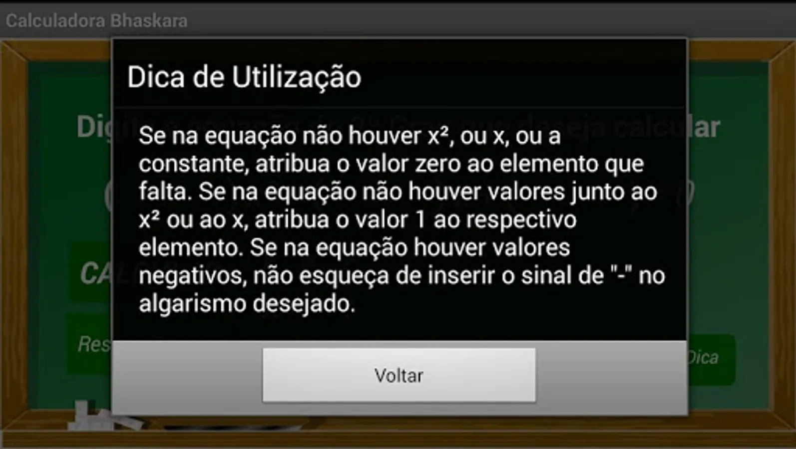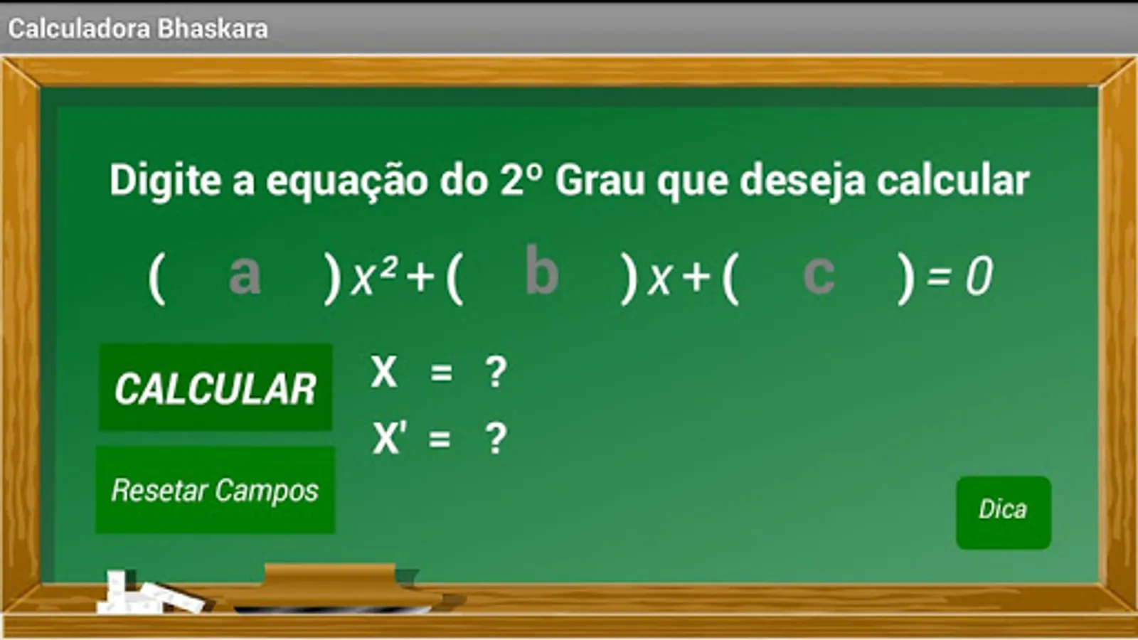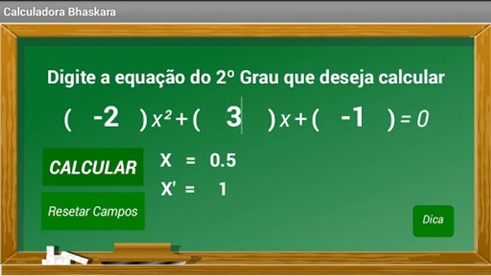 This application performs the calculation of the quadratic formula for solving 2nd degree equations. You only need to enter the numbers next to the variable and constant.