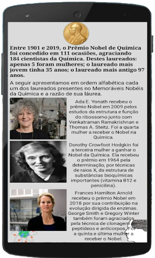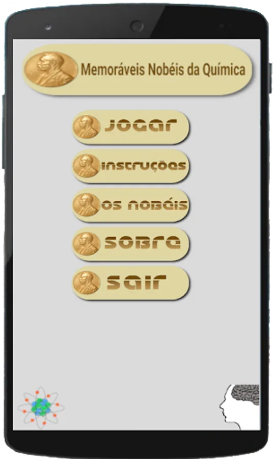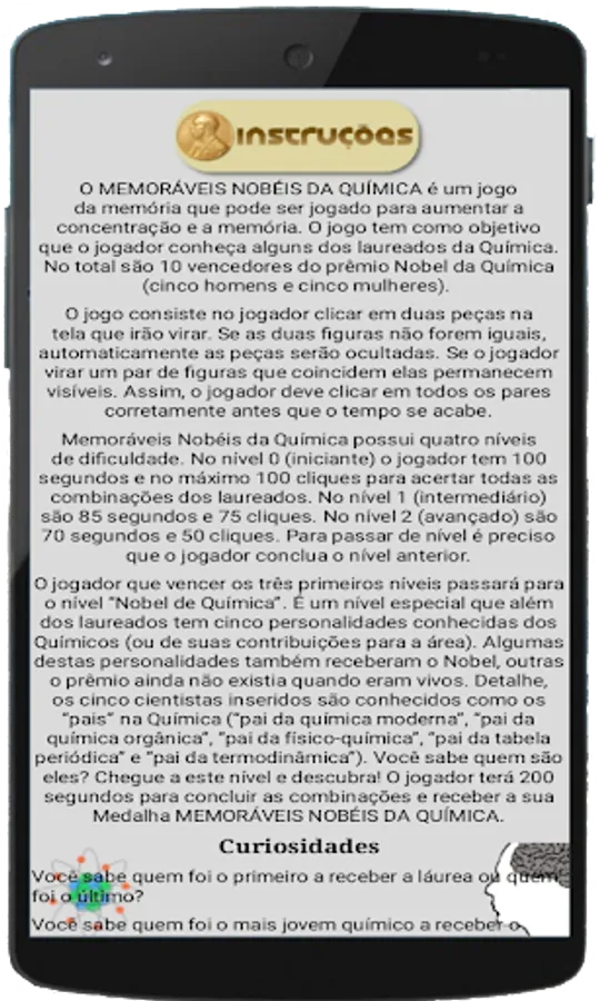 These and other curiosities are answered in the “The Nobel” menu and some tips on how to use the game in teaching Chemistry are suggested in the “Instructions” menu.