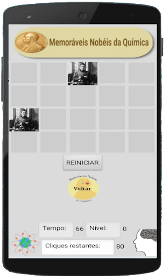 The game consists of clicking on two pieces on the screen that will show the image of a Nobel. If these two images are the same, the scientist will have his screen permanently visible and must continue choosing other pairs, if the images are different they will be automatically hidden. Thus, the player must click on all pairs correctly before time runs out.