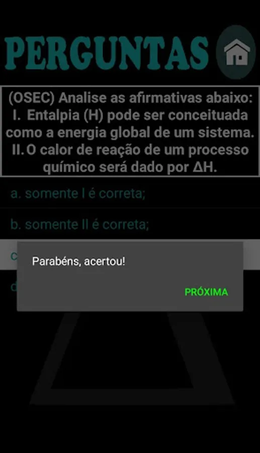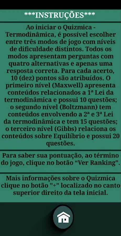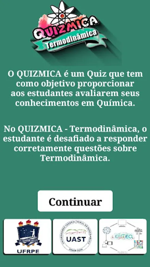 QUIZMICA - TERMODINÂMICA is a Quiz application, in which the player is challenged to correctly answer questions related to Thermodynamics - an area of Chemistry in which the energy transfers and transformations of matter are studied.