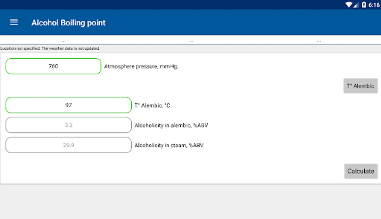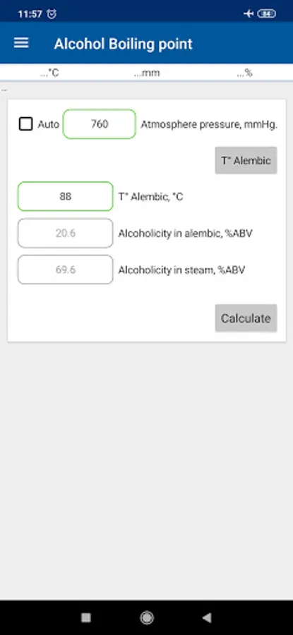 5. Current alcohol content in the cube and outlet of the distiller, as well as the current alcohol content in the cube, corrected for atmospheric pressure;