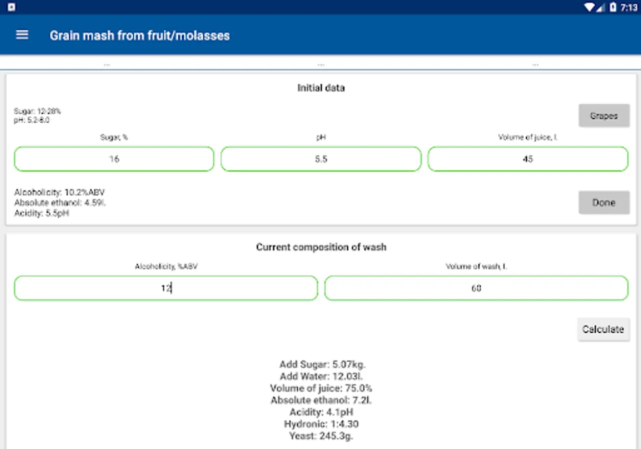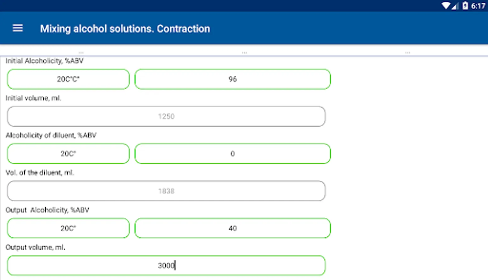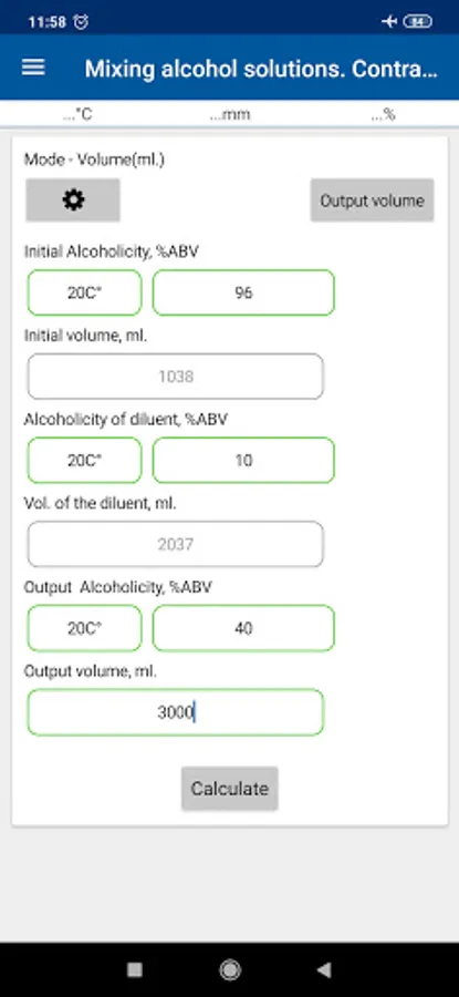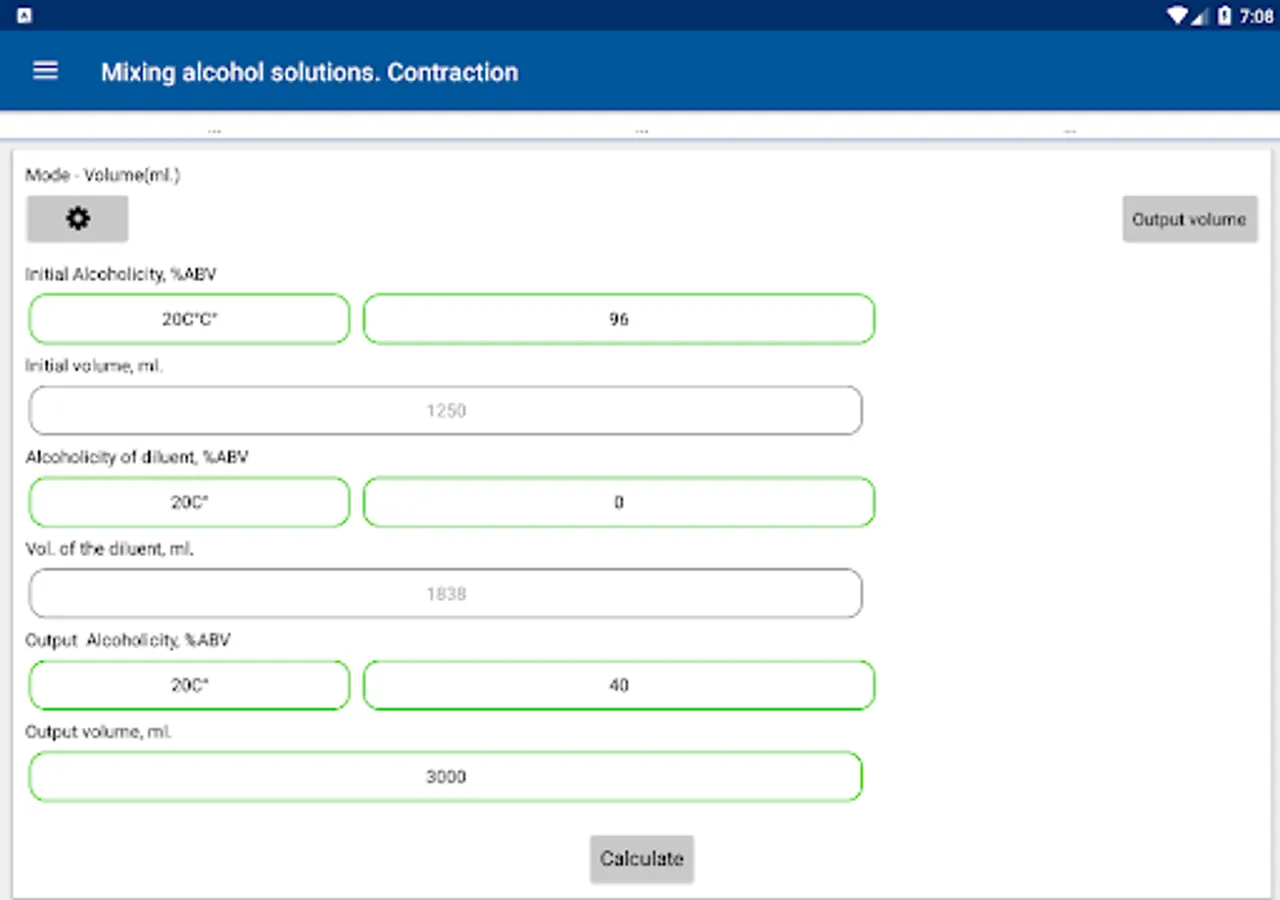 10. Mixing and diluting alcohol solutions with regard to contraction, with the possibility of calculating both volume and mass;