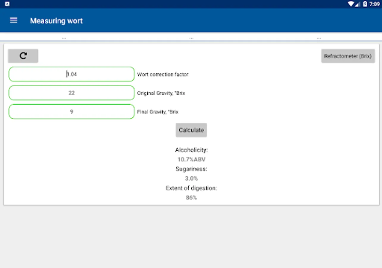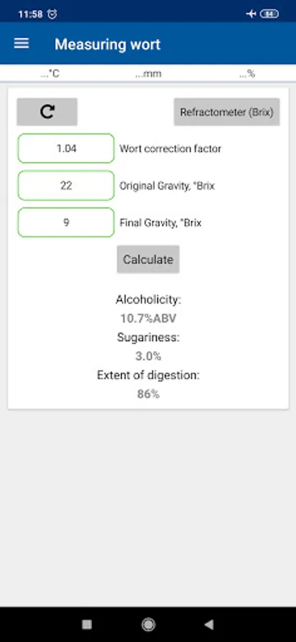13. Wort Measurement: Calculation of residual sugar content, alcohol content and percent digestion in °Brix, SG, %Sugar;