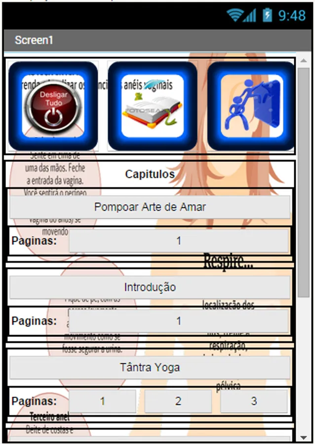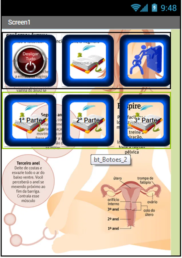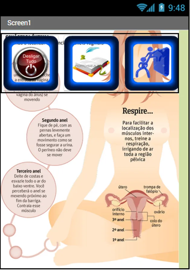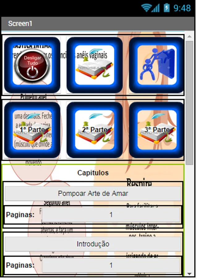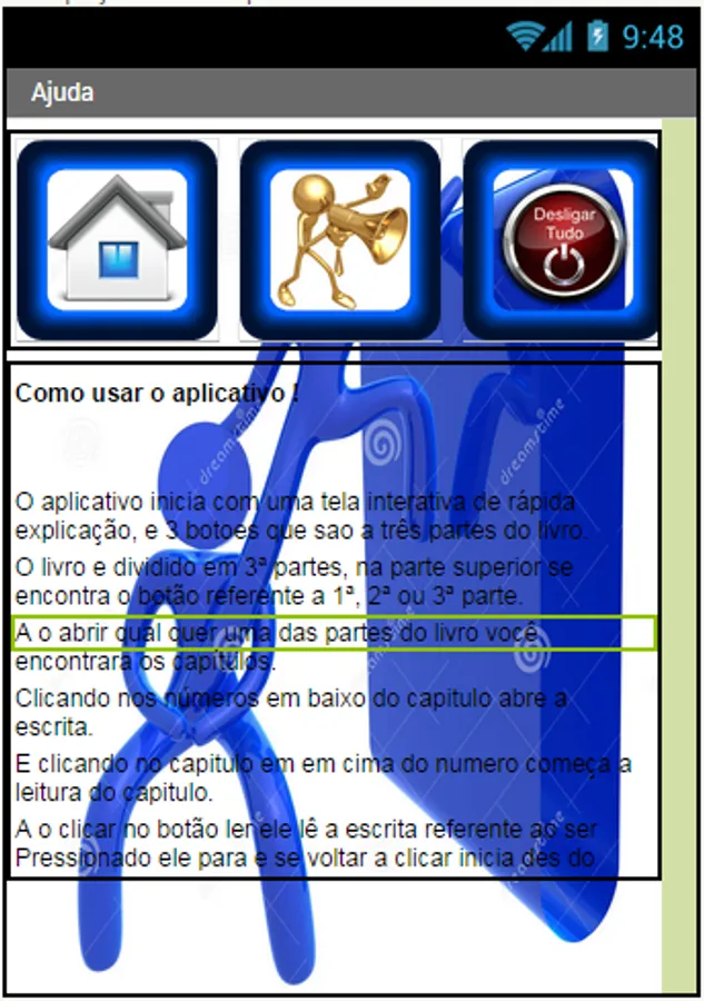 The application starts with an interactive screen for quick explanation, and three buttons which are the three parts of the book.