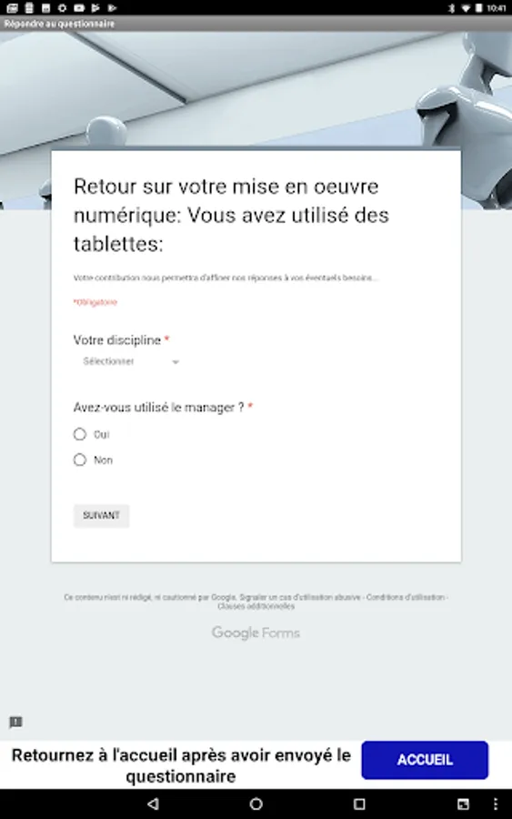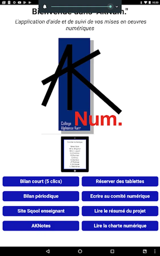 This application is intended for teachers of Alphonse Karr College. It allows the reservation of tablets but also the centralization of the balance sheets of different digital implementations.