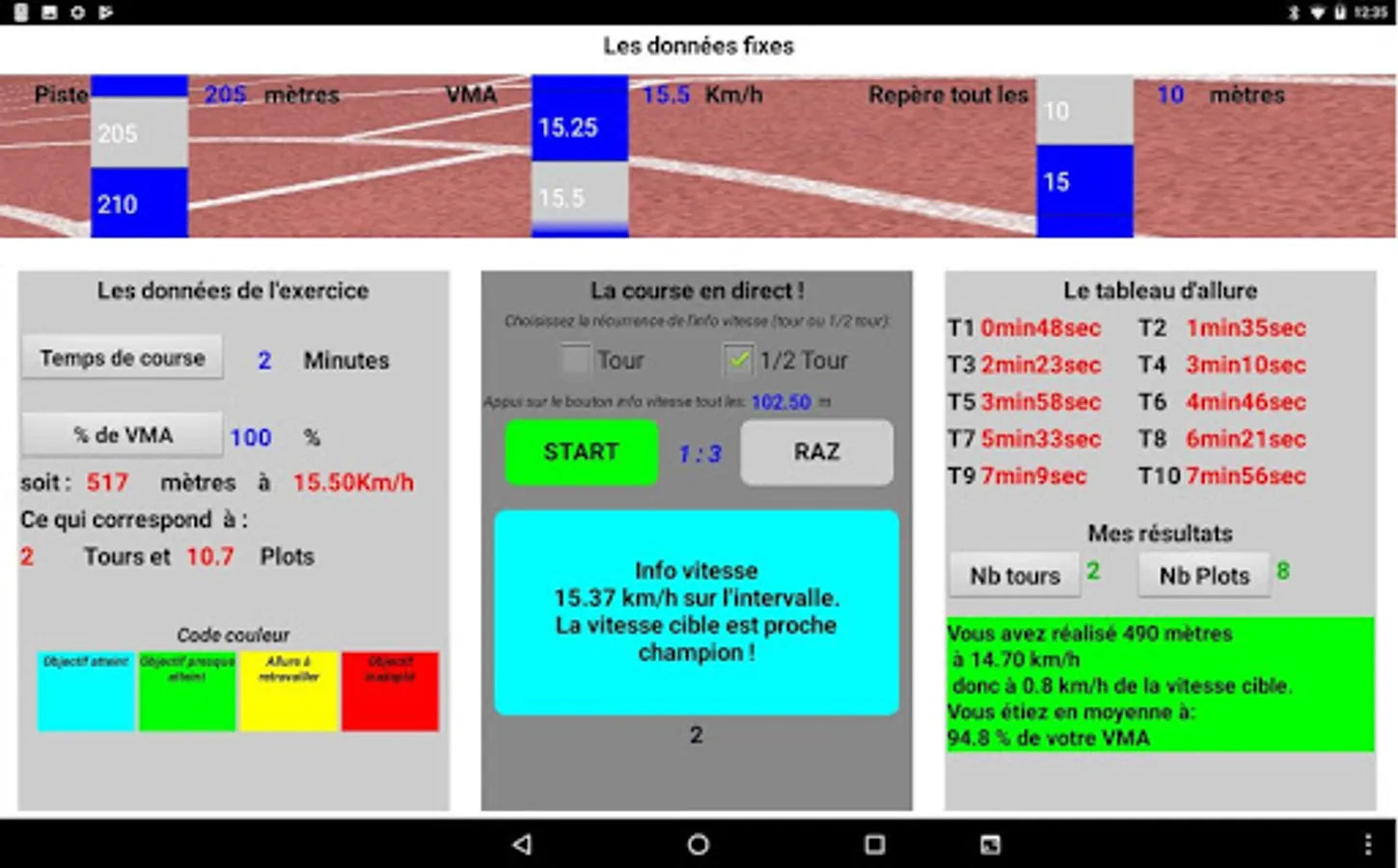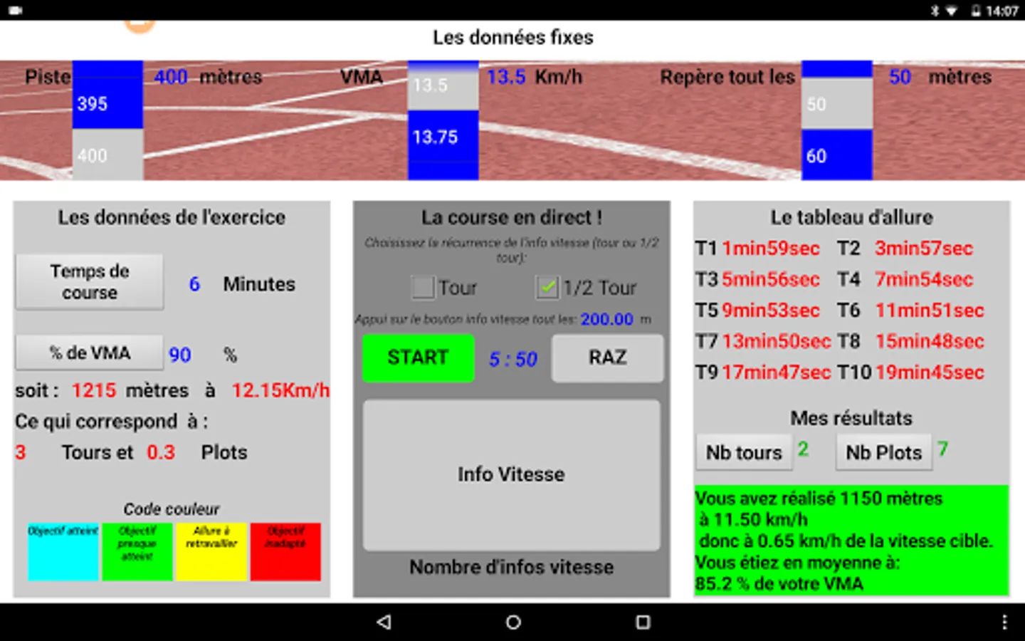 The application will then show you the objective speed and the distance to be achieved (in meters and lap (s) + number of marks)
