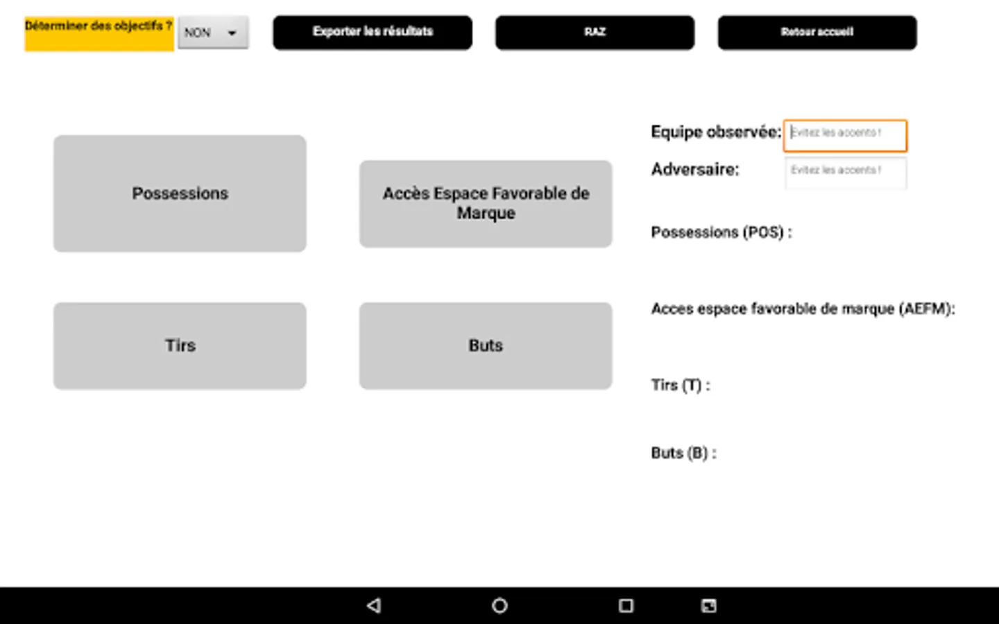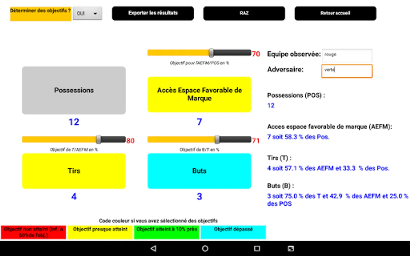 If you have not set goals with your students (typical case of a first session) you will use the first screen (at initialization). The buttons will remain gray. The information will appear under the buttons, and a summary with the different percentages on the right of the screen (see Screenshot 1).