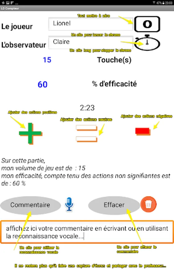 It allows thanks to its form of observation sheet, fill in the names of players and observers, throw or not a timer and set the theme or to comment on the results.
