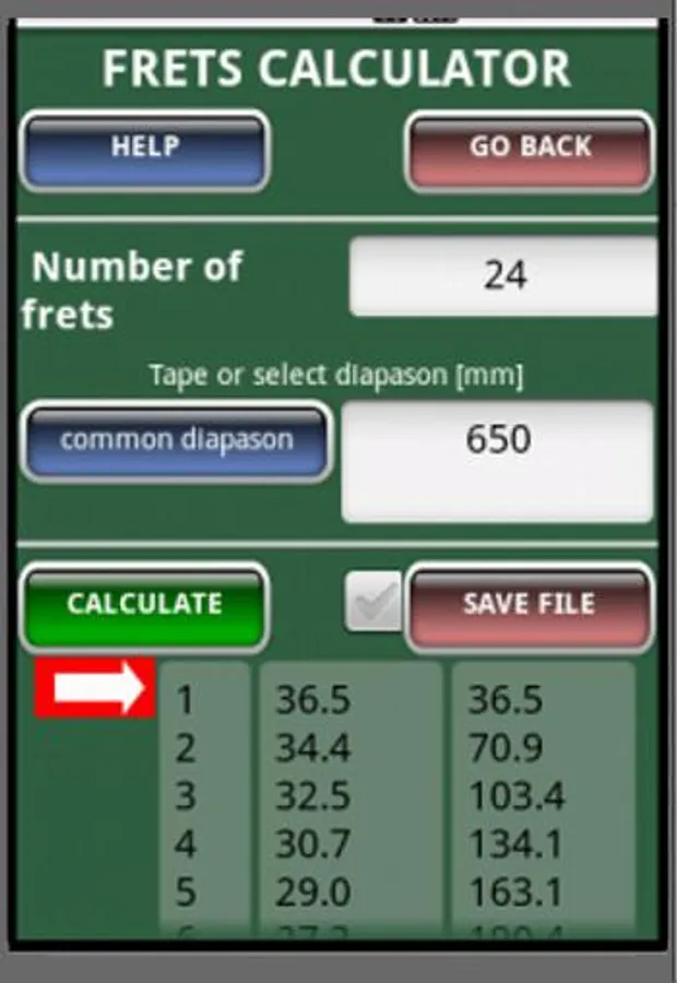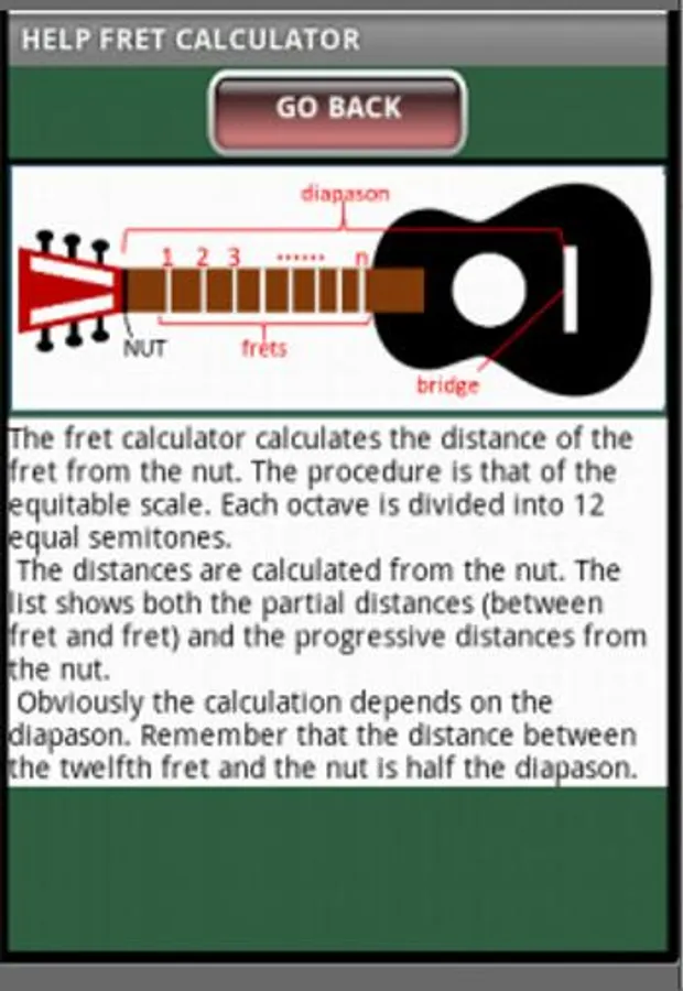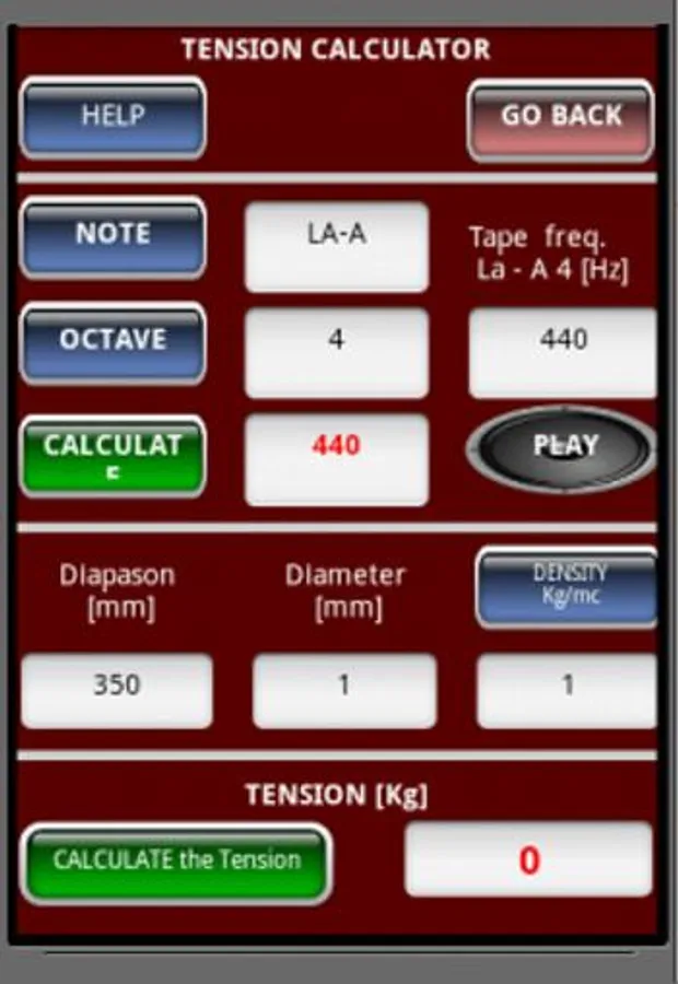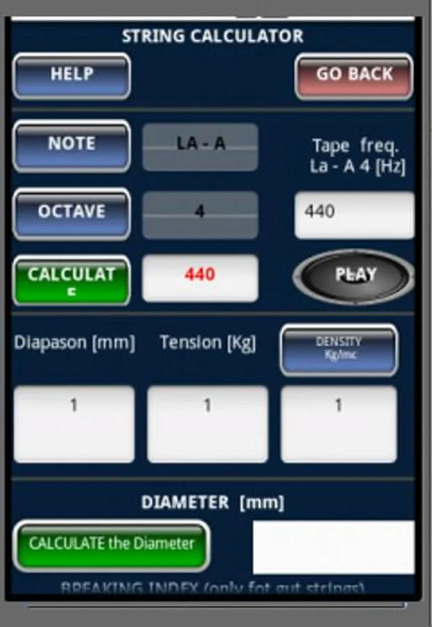 The string calculator allows to calculate the diameter of the strings for musical instruments. The string material can also be chosen. It also allows to calculate and play the frequency of notes with different tunings (frequency of the note LA - A 4 octave). It is also possible to calculate the string tension. Finally there is a FRET CALCULATORE (with bookmark) and the possibility to save a file in txt format.