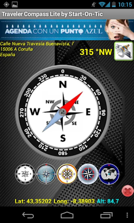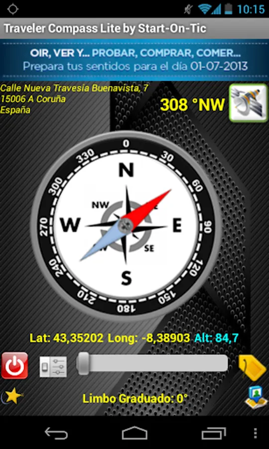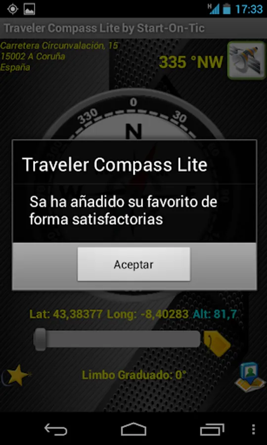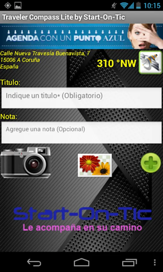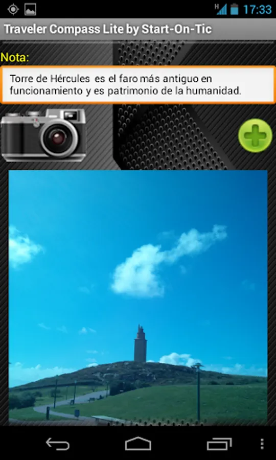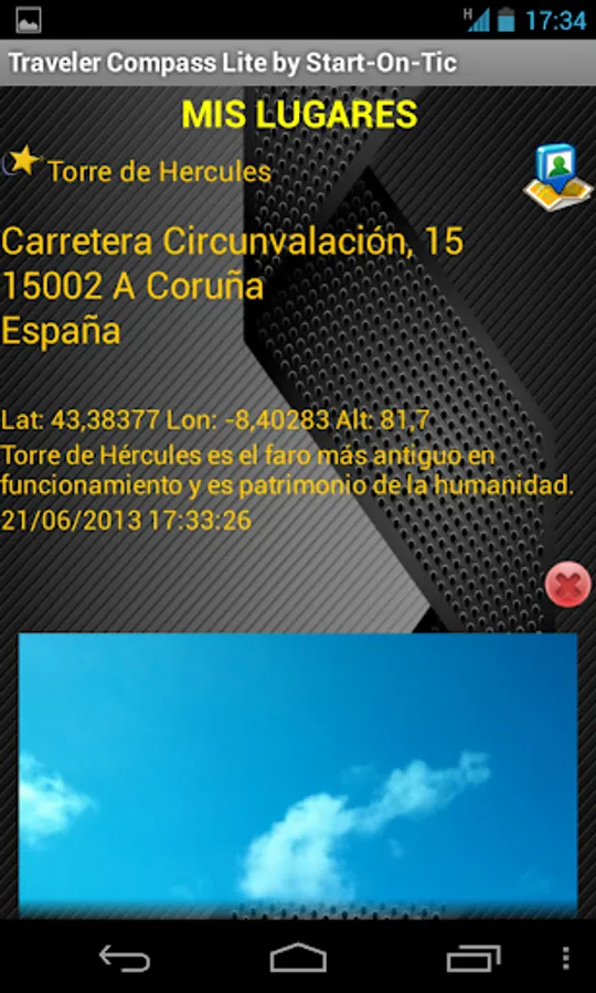 Traveler Compass Lite also allows you to save a favorite site, with its coordinates, address (if using the data rate is), altitude, a title, a description and photograph of the environment. Since this is a powerful tool if you are outside of your environment which may be able to return to that site demarcated as favorite (Place your hotel, your friend's house or whatever location you want to return.