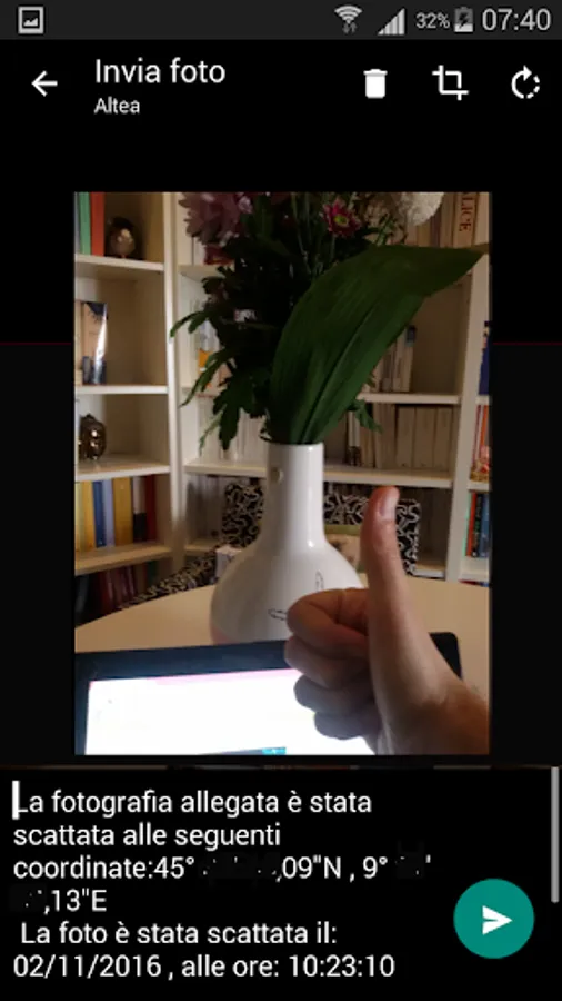 Once you have the information you can add a comment and post the photo as a social or email: this way you can, for example, make cards with pictures, coordinates and comments; or send via Whatsapp or Telegram a picture with clearly visible to the coordinates where the photo was taken, the date and time and a comment on the photo.