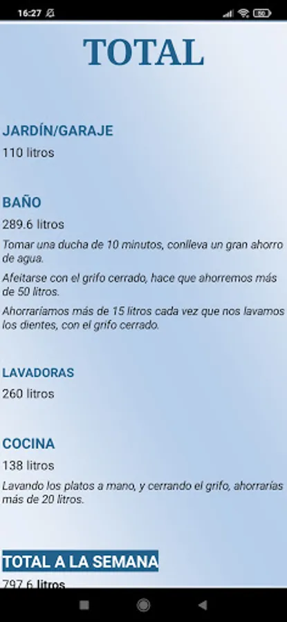 By entering the data it requests, the application will calculate your daily water consumption and will give you some useful tips to save and improve it.