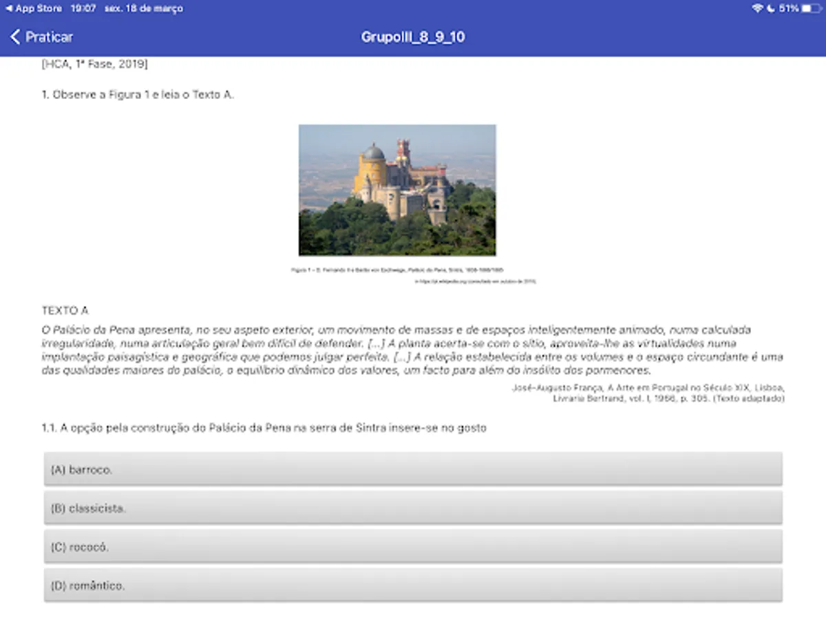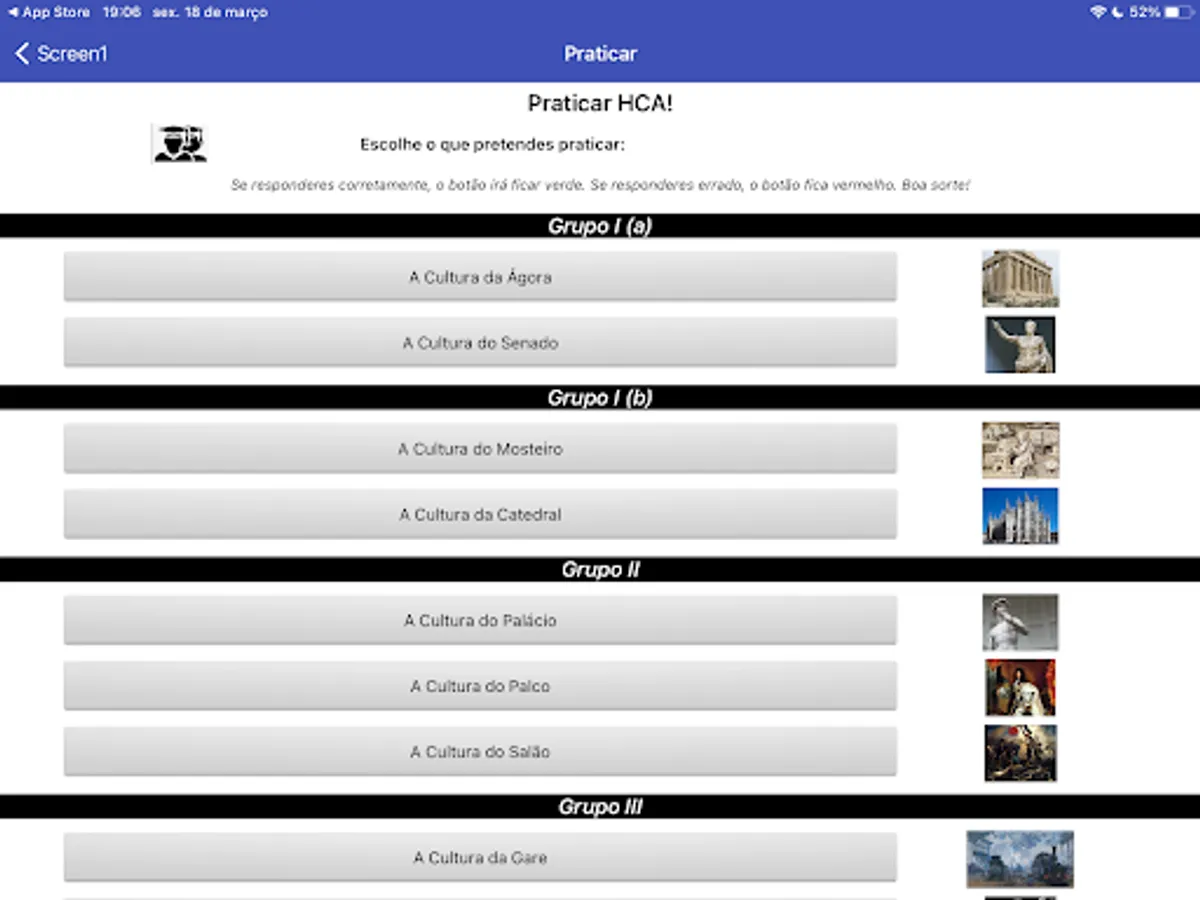 This application helps to study History of Culture and Arts (National Exam). Created and developed by Professor Mafalda. Developed at MIT APP INVENTOR.