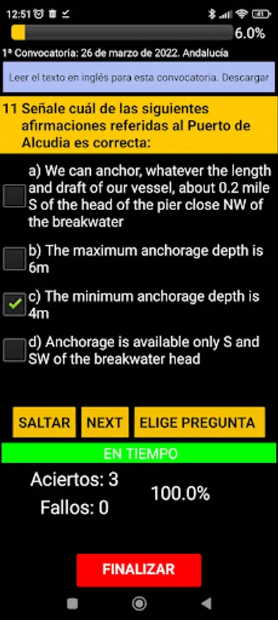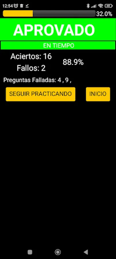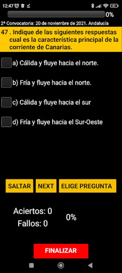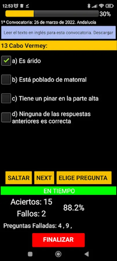 You can choose from which calls you want the questions and see your progress of successes and failures, skip questions. The test will continue until you finish it or you have answered all the questions correctly, the correct questions do not appear again but the incorrect ones or the ones that you have skipped will continue to appear randomly until they do, although you can also choose which one you want to be next Question.