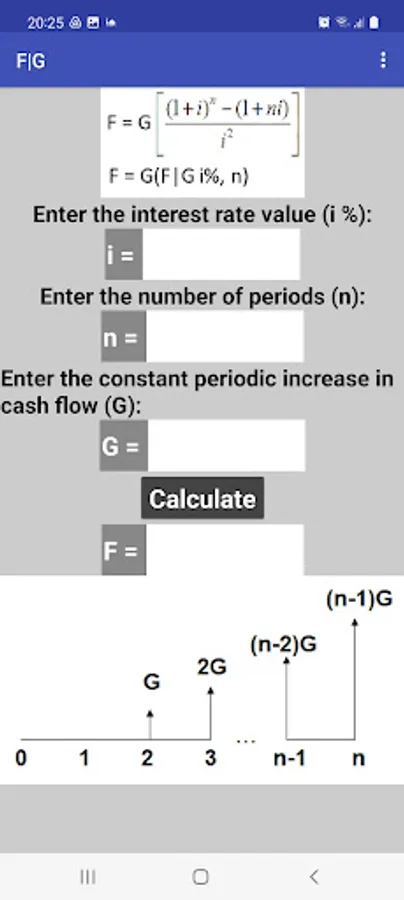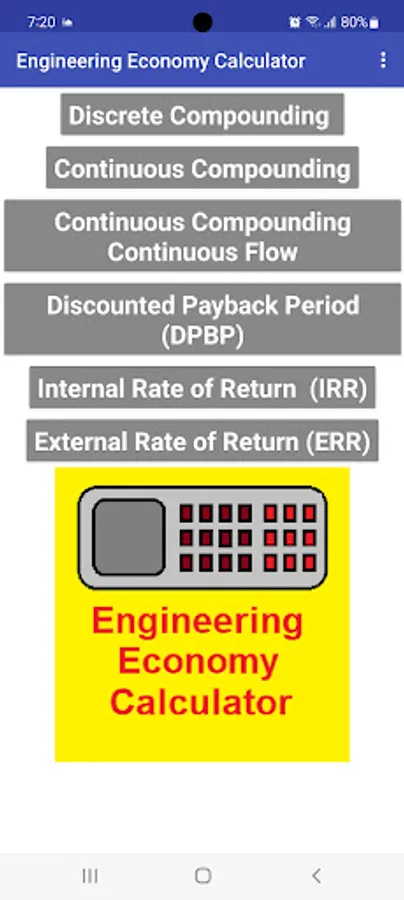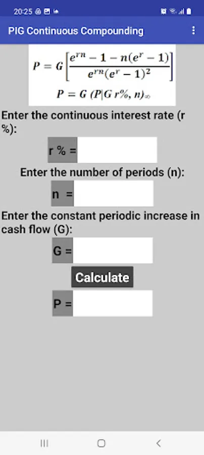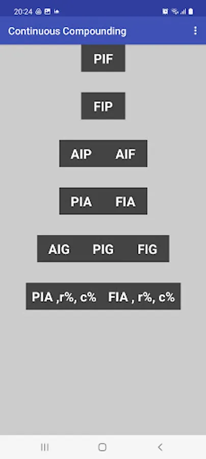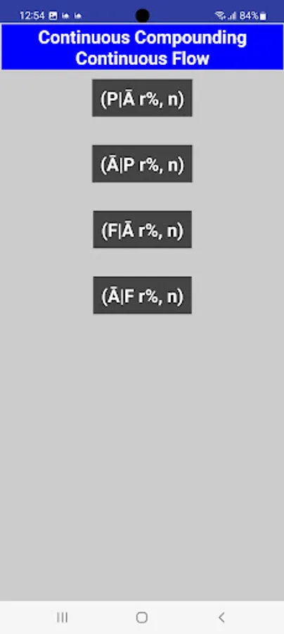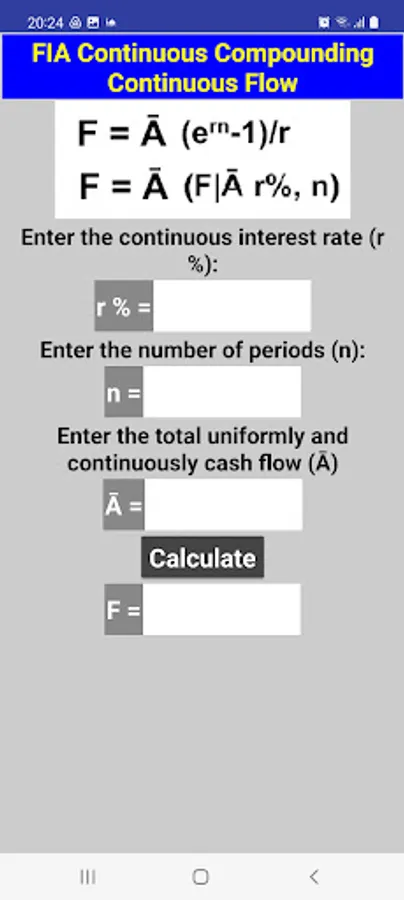 This application can calculate different discrete compounding interest factors, continuous compounding interest factors and continuous compounding continuous flow factors.
