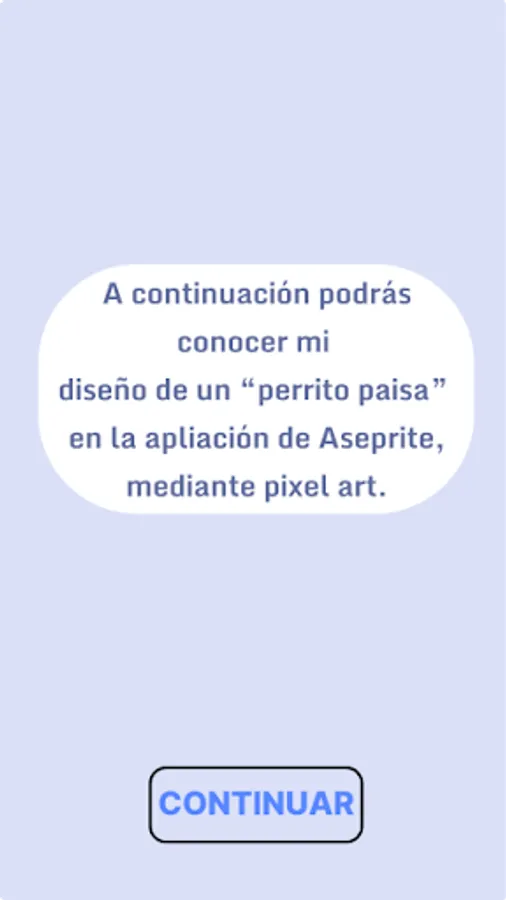 In this application you will be able to find a simple graphical interface, where you will be able to interact with different buttons, immersing yourself between different screens to finally find the design of a 'paisa dog' made with the Aseprite application.