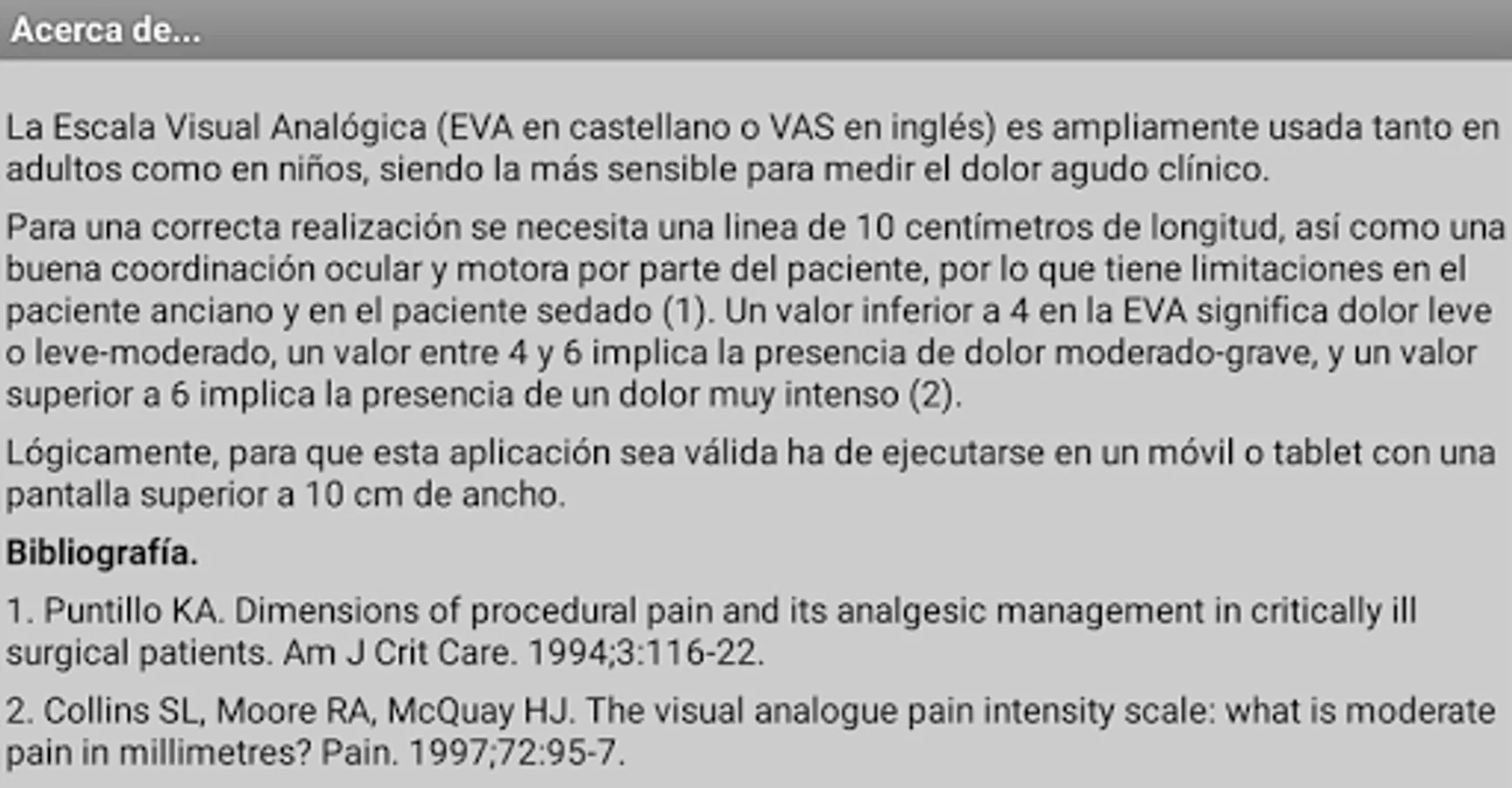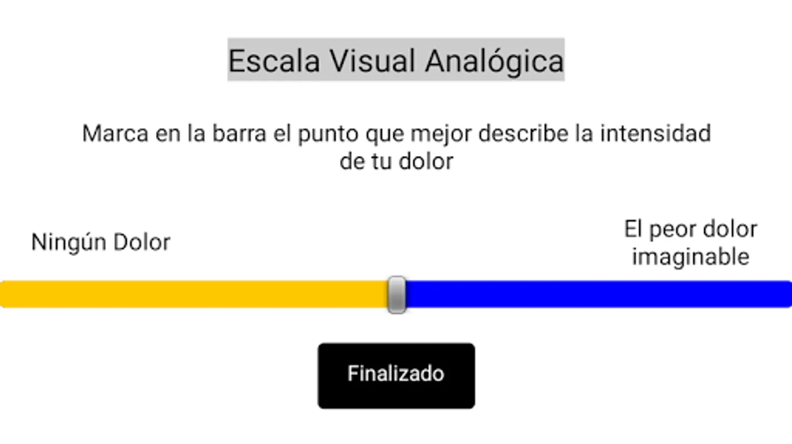 It is a small application that graphically plasma Visual Analog Scale, which is one of the most widely used pain scales worldwide for both children and adults. You just have to bring the slider to the point that best describes the pain felt by the person, considering to take it to the far left means no pain, and take it to the far right means that the pain suffered by the patient it is the worst pain imaginable.