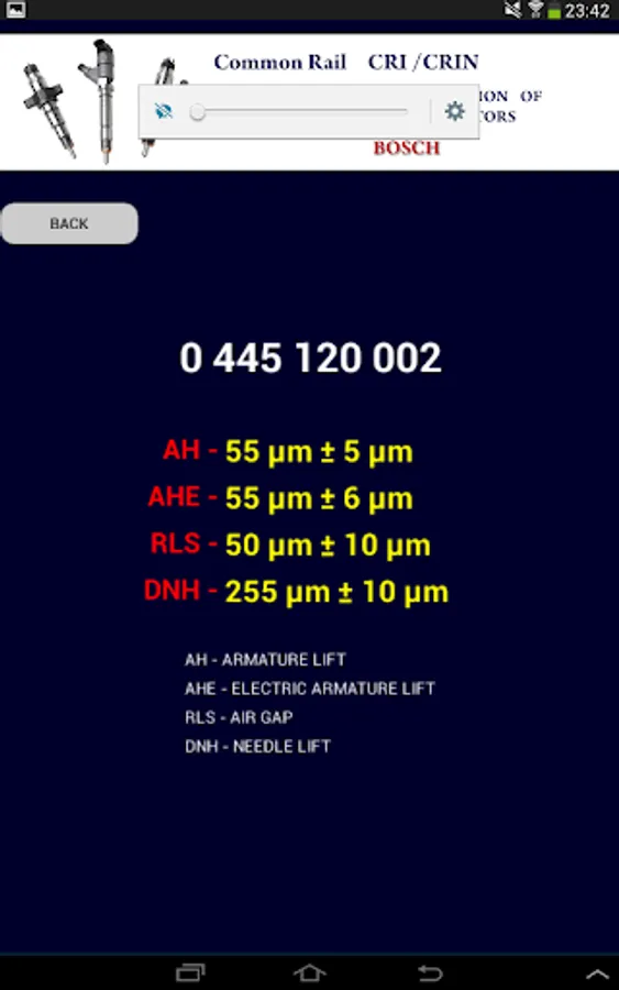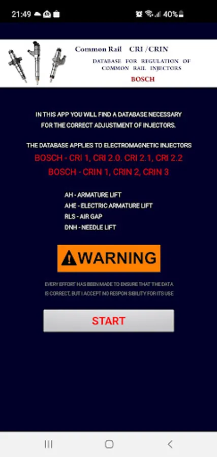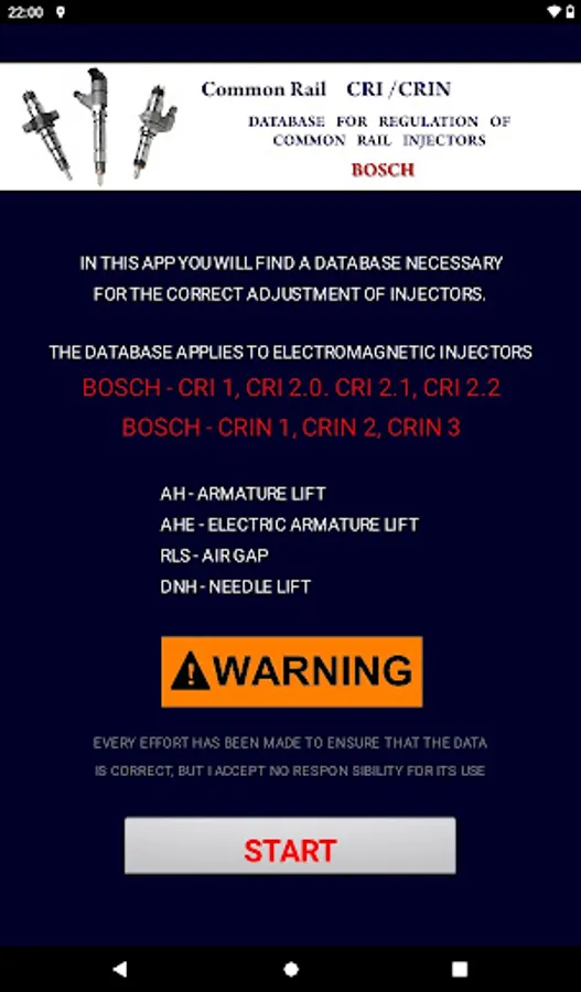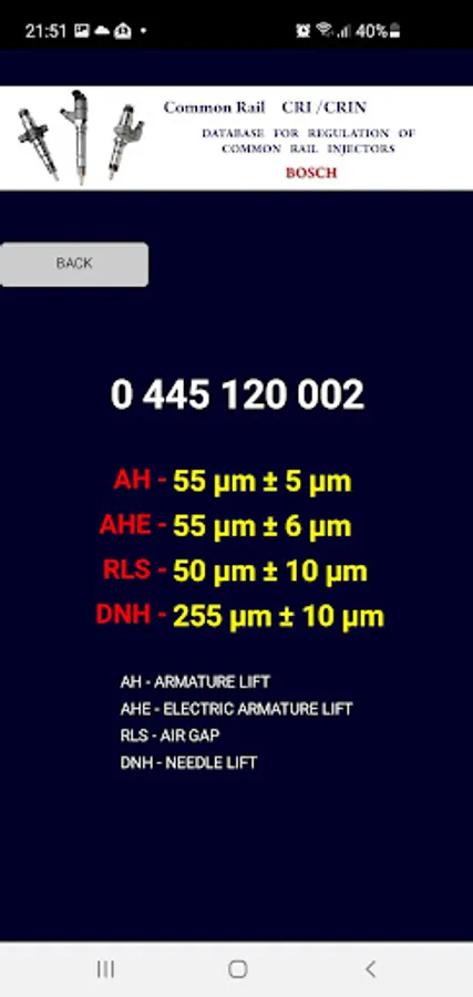 The App is a set of regulatory data for COMMON RAIL Electromagnetics Injectors from Bosch.