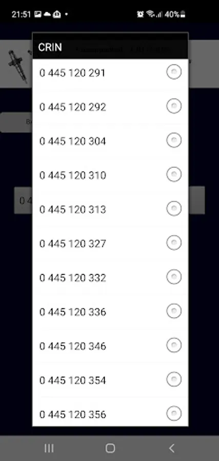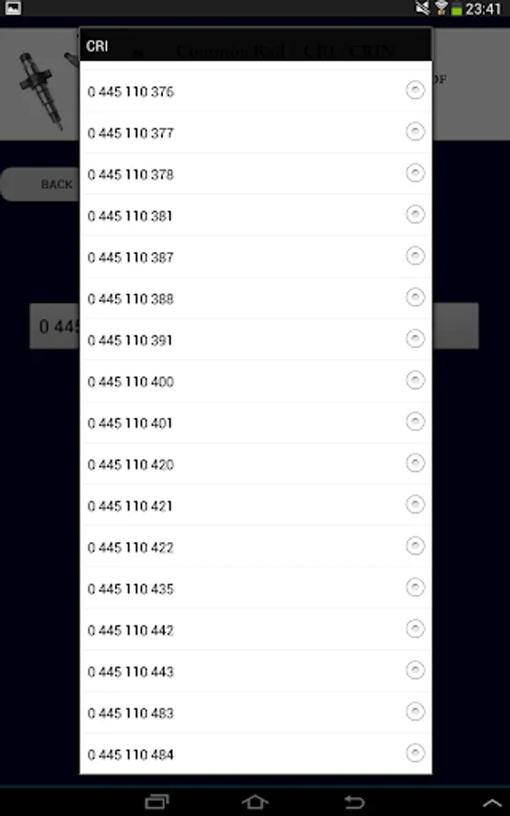 The data contained in the app is divided into injectors for cars and trucks (CRI and CRIN).