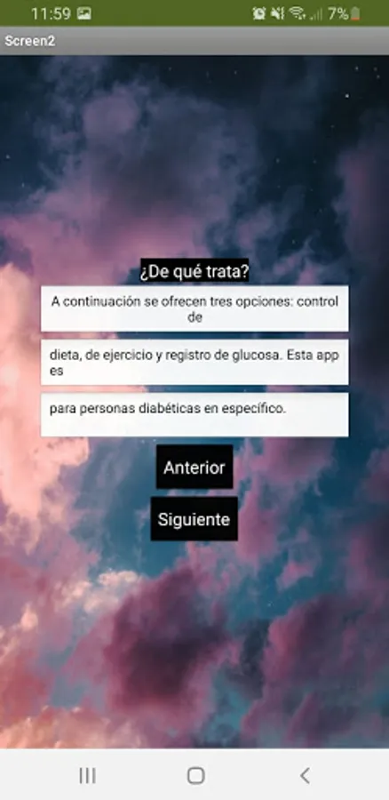 DiabControl is an application dedicated to controlling and reporting on diabetes, Mexico is the number 6 country in the world with more cases of diabetes and that is why we decided to support the population that suffers from it, the app can be used by people of all ages since it is very easy to use and in a certain part it asks for your age. Our application consists of 6 screens where the first 3 serve as a welcome, tutorial and menu, since in the remaining 3 the control part is done, the fourth screen is a daily calorie count, where a record of how many calories is kept are consumed per day, on the fifth screen is the part of physical activity where depending on your age gives you certain physical activity to perform and this will be perfectly explained, finally, the sixth screen is dedicated to glucose control where you can take a record of your daily measurement. Our goal with this app is that the user becomes aware and can realize that glucose depends on the food they eat and the calories consumed changes, that is why when the user begins to register and see the results they seriously realize that You must change your diet and start exercising, diabetes is a silent killer and we cannot let it go.