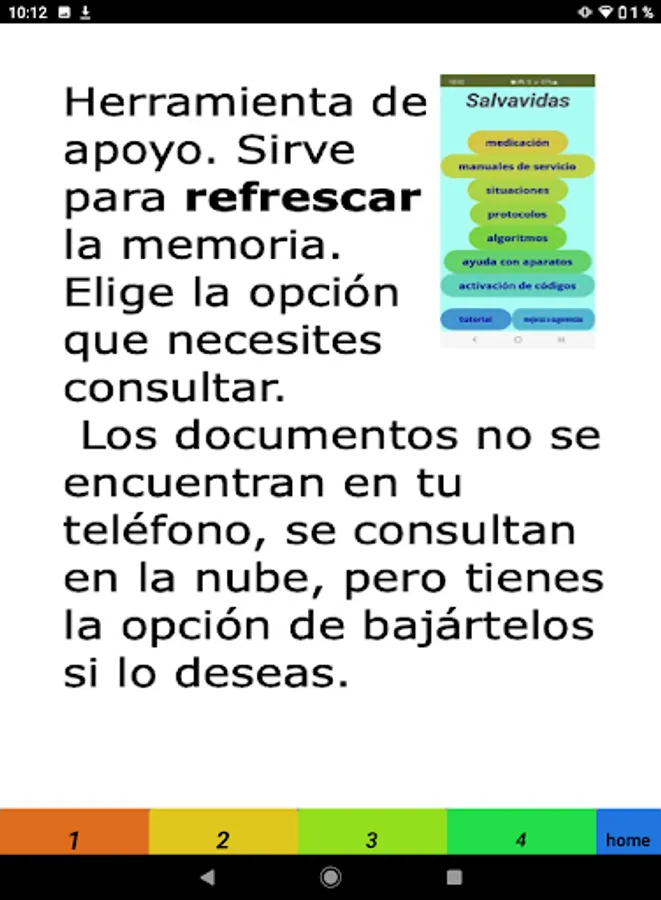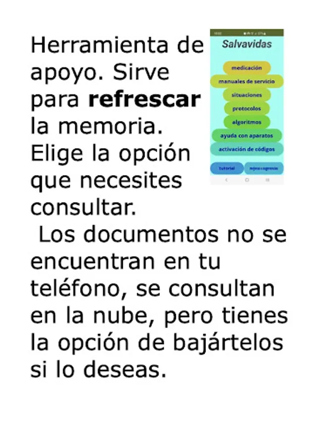 Prepared with files from different emergency services, guides and guidelines for action can be consulted. It is not a substitute for professional knowledge. It is a tool to refresh your memory. The contents can be updated without having to update the app.