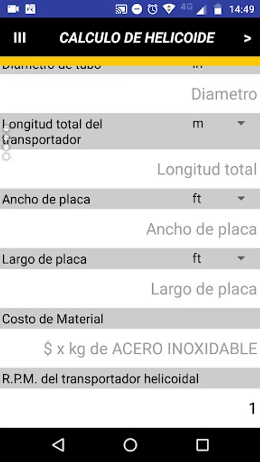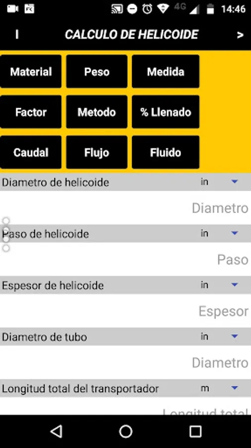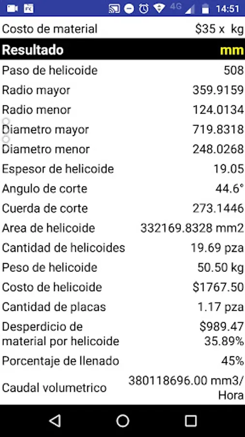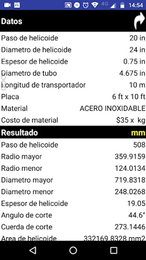 Calculate the helicoid of a helical conveyor, it asks for the unit of measurement and weight of the result, as well as method of saving plate, percentage of helicoid filling, also volumetric flow.