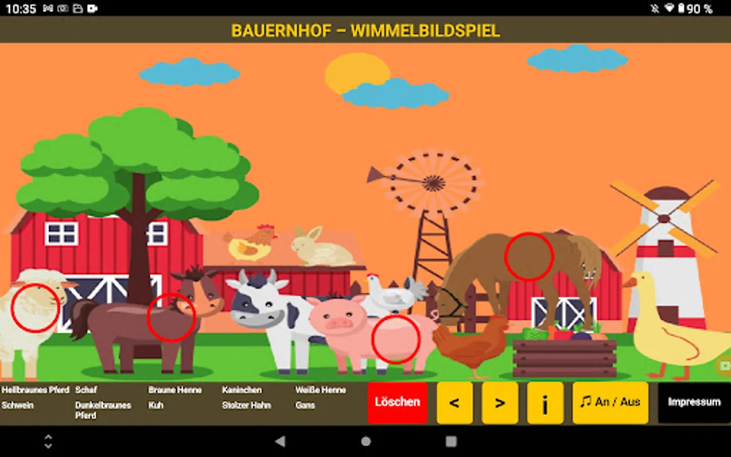 Boost your cognitive skills with the farm hidden object game. Your task is to find ten farm animals on each field and mark them with a squiggle by tapping them. You can easily clear the playing field with the clear button for a new game. With the forward key > you come to the second playing field, which shows a sunset mood on the farm, with the same task. This game is especially interesting for all people who want to keep their memory fit and improve their cognitive abilities. The game is accompanied by typical farm noises made by the animals (can also be switched off). Have fun playing! Ad-free - Free. Language: German.