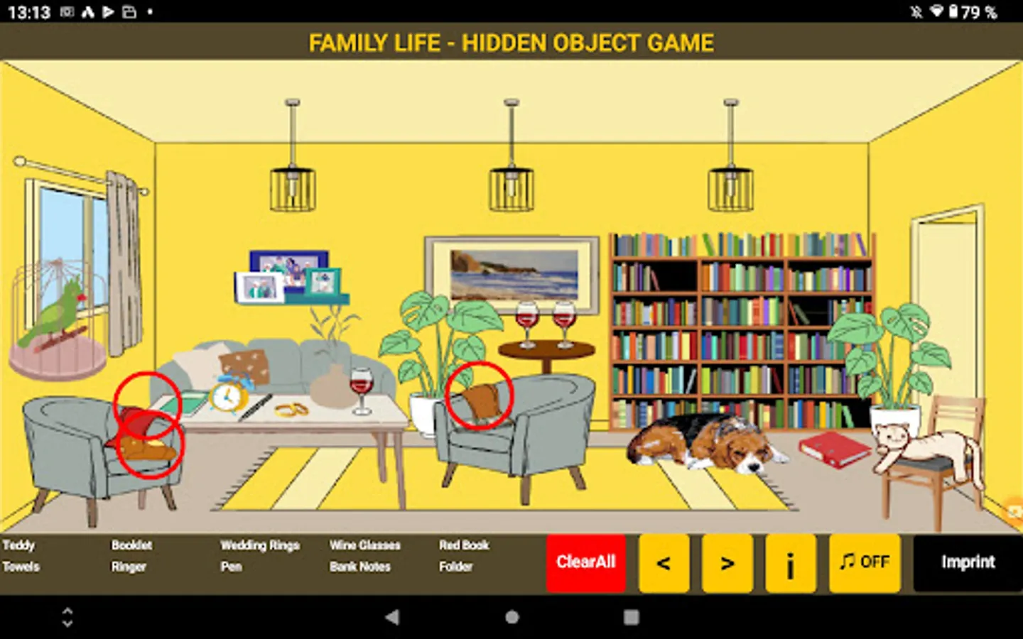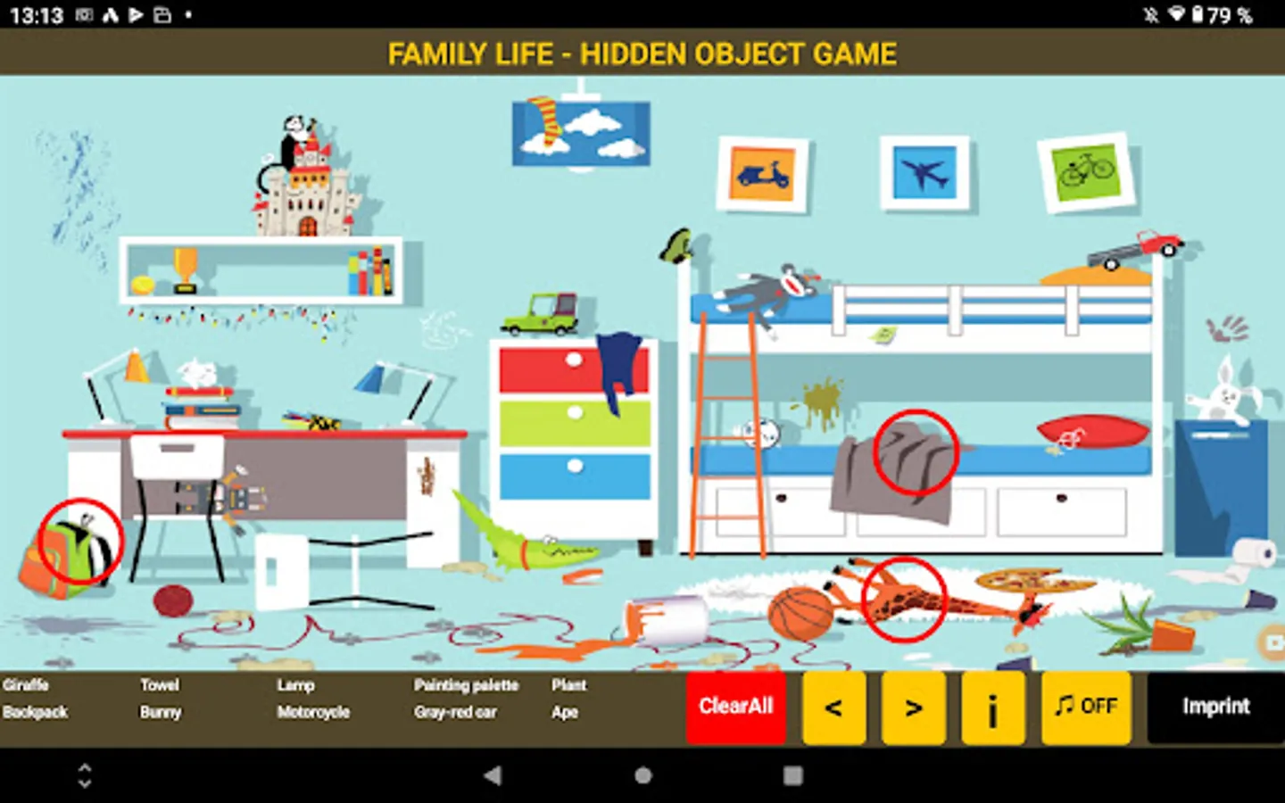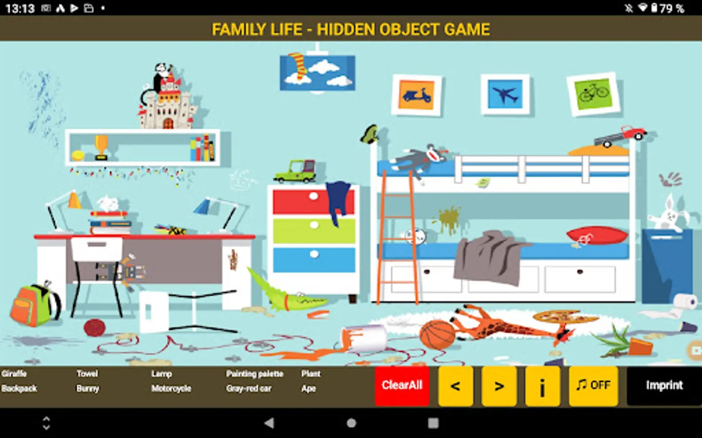 Find hidden objects in your living room and in your children's room (2 rooms available). Below the game area are the items listed you have to search. The game contains funny comedy music.
