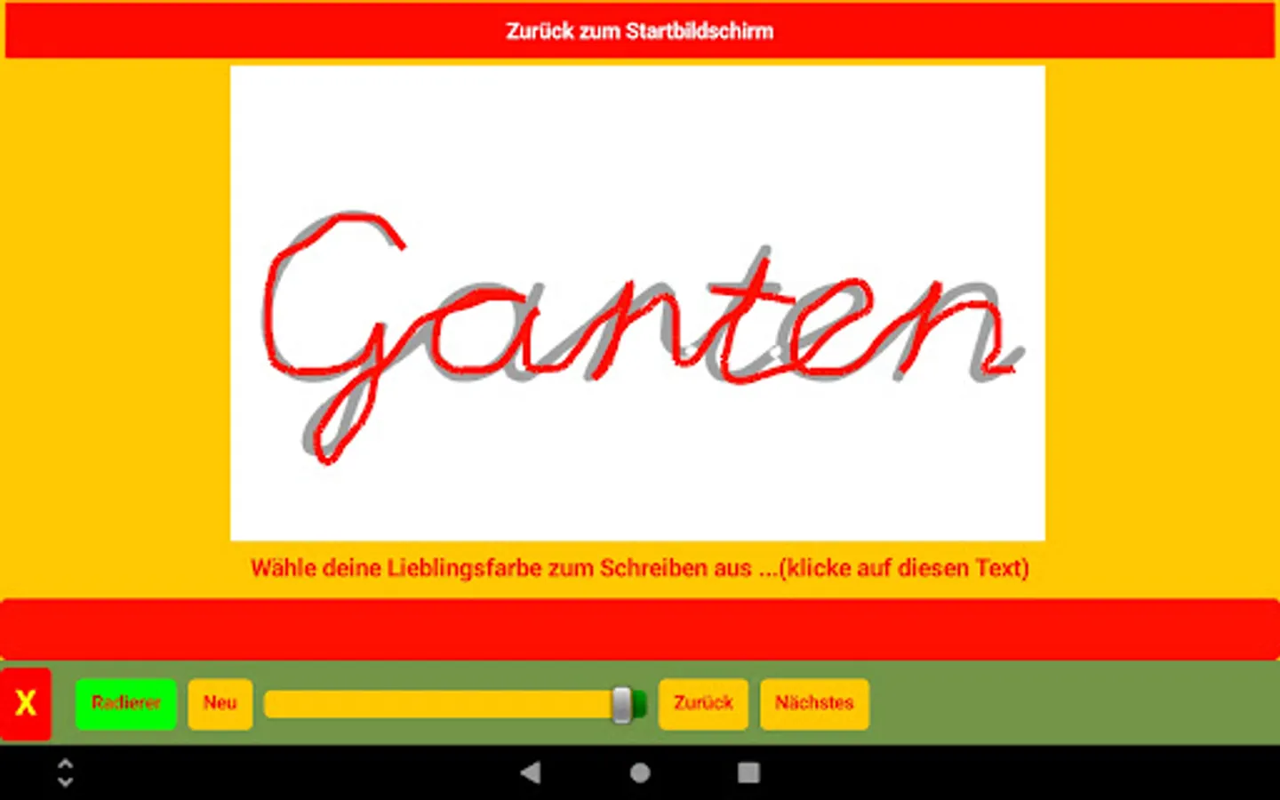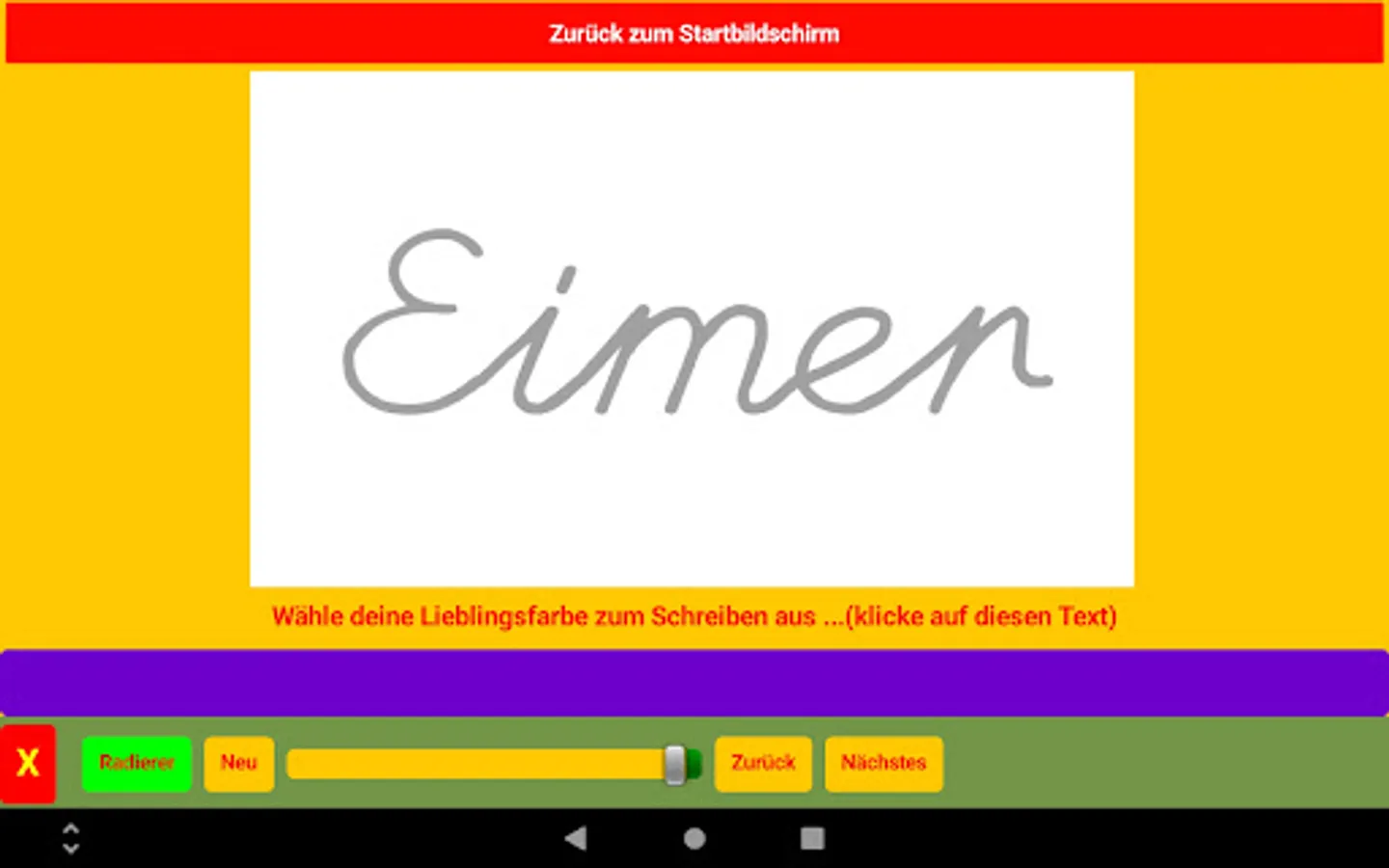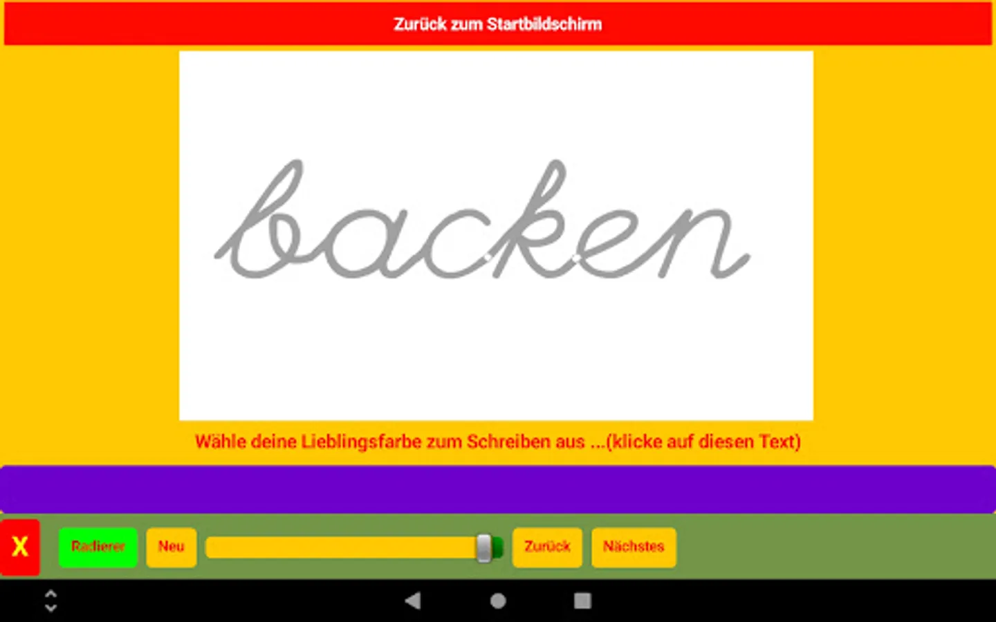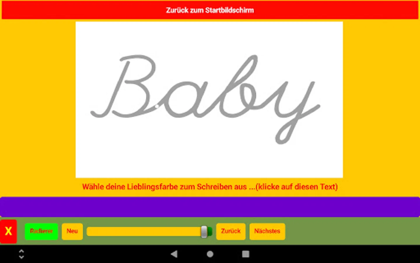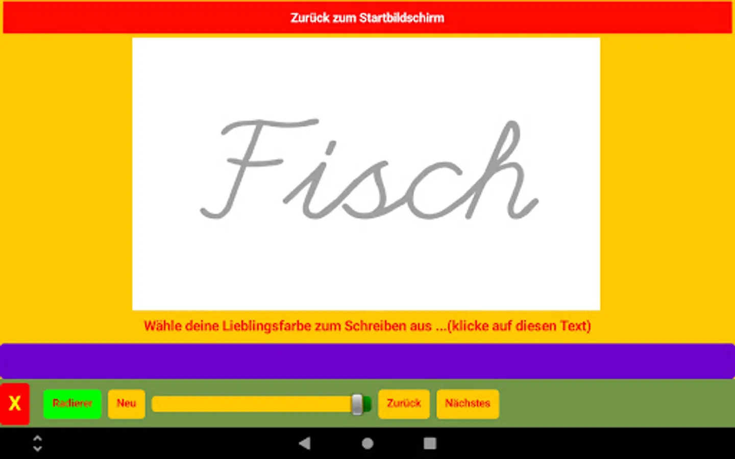 There are two screens in the app, besides the home screen. On one screen, children practice writing a word or letter by realistically writing a word on a painting surface using a tablet pen. There is a picture with the word behind it. The painting surface can be erased and erased with the eraser.