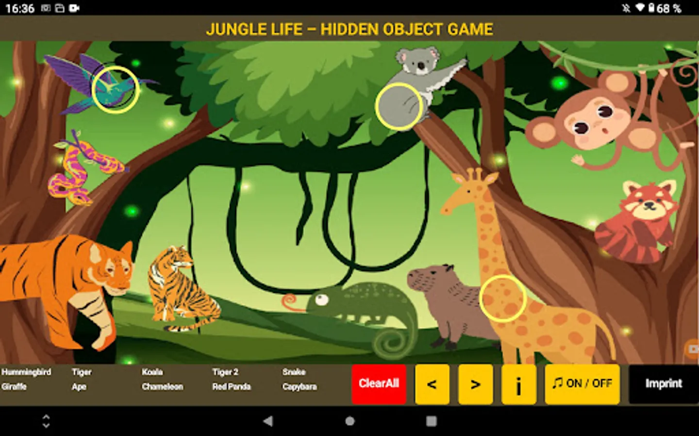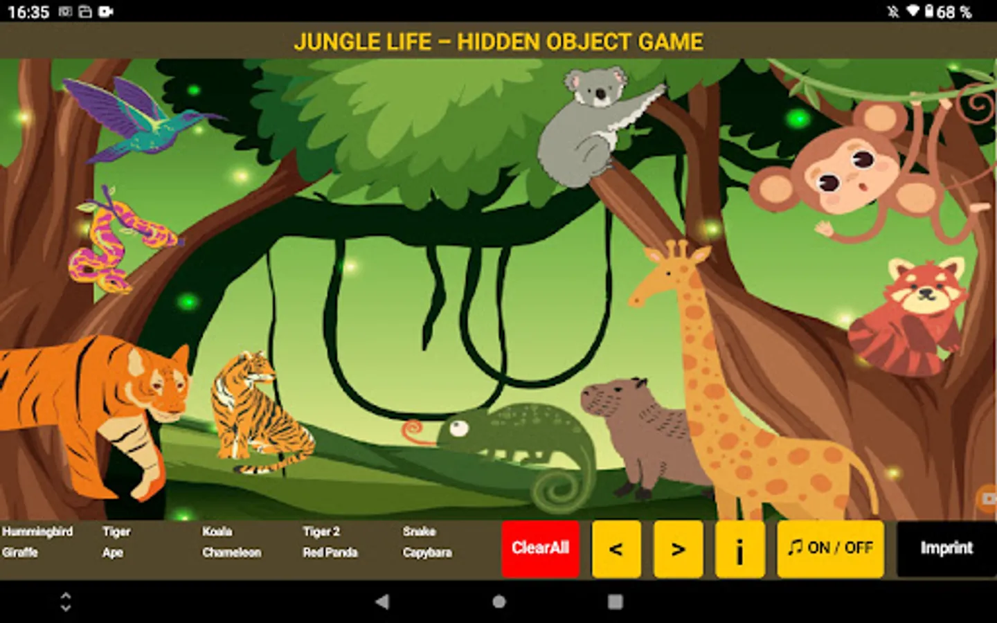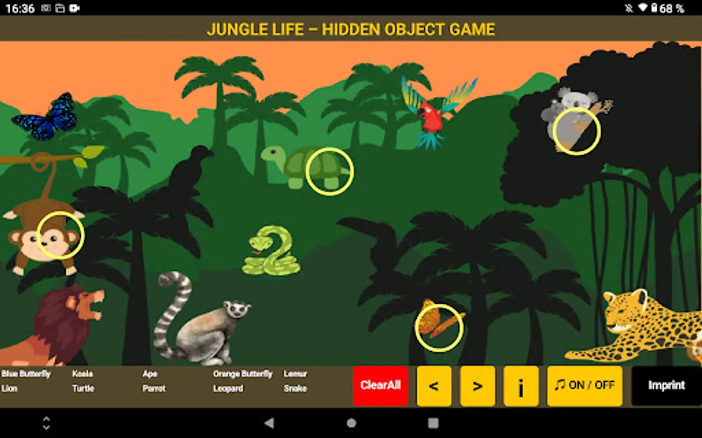Enjoy the free and ad free jungle hidden object game! Your task to find animals in the jungle. If you have found an animal, you tap on it and a circle is drawn. The hidden object game has two game areas: day and sunset time. The jungle life game contains jungle animal sounds (you can switch them on and off). Enjoy it!