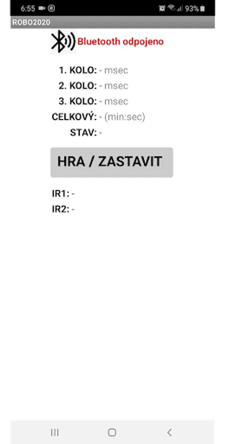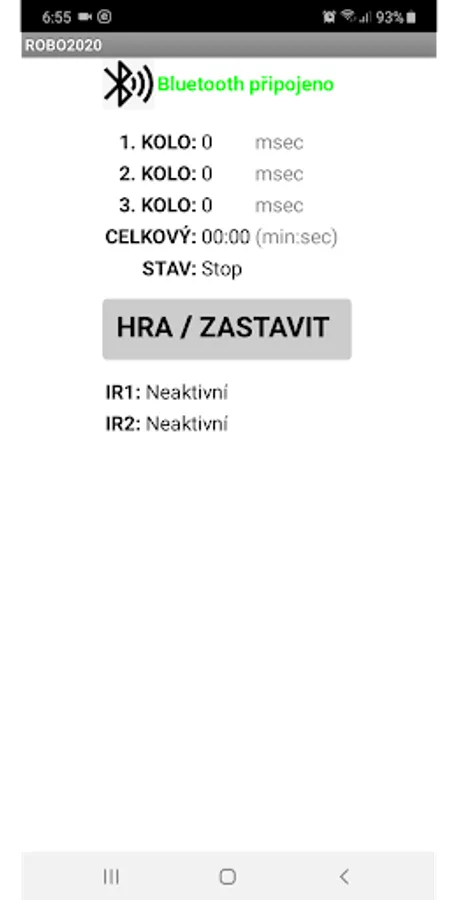 The timekeeping is used to measure the lap times of the ROBO2020 robotic competition. The timekeeping contains a matrix (display) of 16x8x8 points. Measurement is done by 2pcs IR gates. The total time of the competition (for each team) is 7 minutes. Each team has 3 attempts (within a total time of 7 minutes) to cross a defined route. The resulting times are sent from the timekeeping via USB to a computer where the measured data are displayed in Excel. This app allows you to control the timekeeping (start and stop measurements) using Bluetooth technology and display the measured times for each lap and the total time (displays 1, 2, 3 laps in ms between IR and START, STOP time, total team time (7 minutes), condition of the device (timekeeping) measurement / IR barrier test.