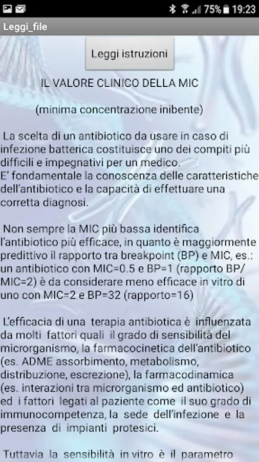 The effectiveness of an antibiotic therapy is influenced by many factors such as the degree of sensitivity of the microorganism, the pharmacokinetics of the antibiotic (eg ADME absorption, metabolism, distribution, excretion), pharmacodynamics (eg interactions between microorganism and antibiotic) and the factors related to the patient such as his degree of immunocompetence, the site of infection and the presence of prosthetic implants. However, in vitro sensitivity is the most easily measured parameter and clinical studies have demonstrated the clinical importance of sensitivity results expressed in MIC. Therefore the need for an accurate and reliable test can only be confirmed; the therapeutic regimen is one of the few factors that can be modified to improve the patient's prognosis unlike his age, co-morbidities, type of infection. In severe infections, in infections localized in sites where the antibiotic penetrates with difficulty and in immunocompromised patients the result expressed with categories S, I, R has a limited predictive value. In these cases a quantitative sensitivity result is very important since it is clear that there is a difference in the clinical response between an antibiotic with MIC of 0.06 µg / ml and one with MIC of 1 µg / ml when the sensitivity breakpoint for both is "1μg / ml. I dedicate this application to the tenacity of my wife Marina. Knowledge must be transmitted if it can save lives.