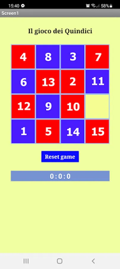 The game consists in solving a matrix of 16 boxes of which 15 are numbered, the strategy is to insert all the numbers in their place.
