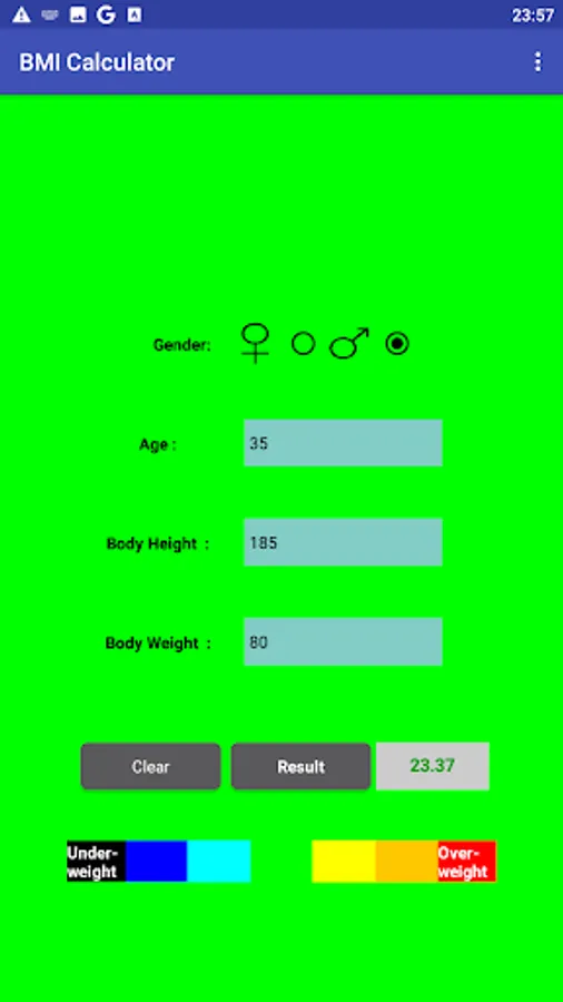 BMI Calculator asks for your gender, your age in years, your body height in centimeters and your body weight in kilograms to calculate your Body Mass Index.