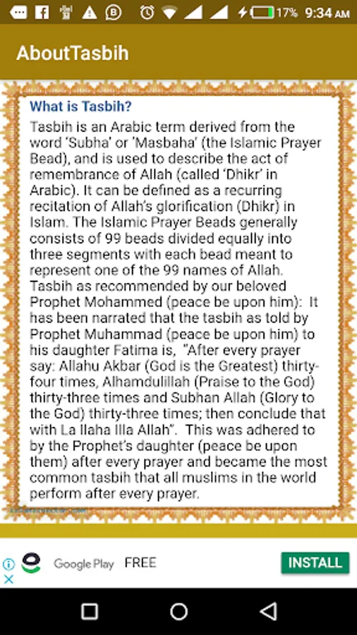 Tasbih (تسبيح) is a form of dhikr that demands the repetitive utterances of a set of words praising AllahSubhanTalla in Islam. To keep track of counting either the phalanges of the right hand or a misbaha is used.