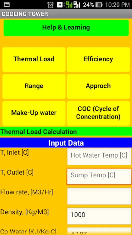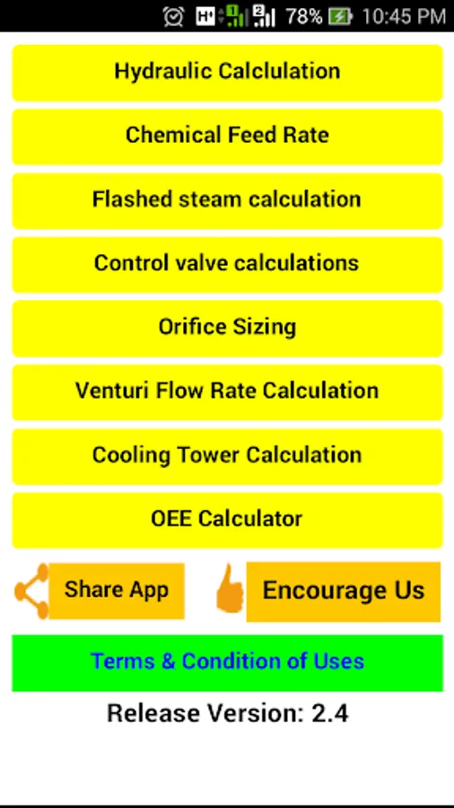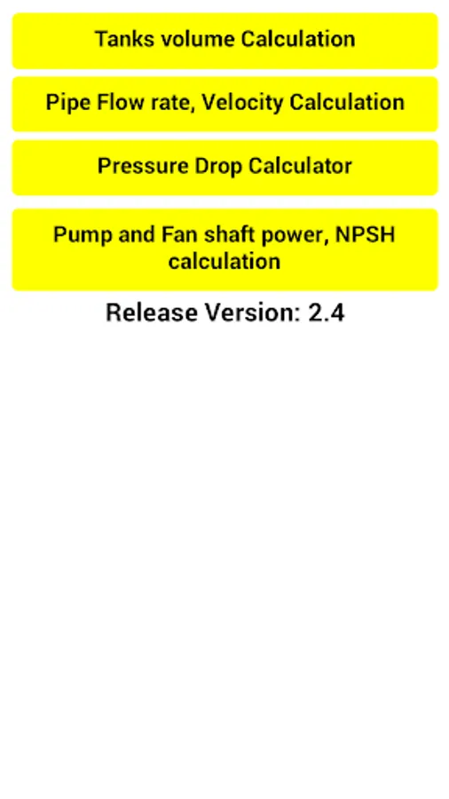 Application provides you the calculator for various calculations like Volume, surface area, empty weight, hydrostatic weight for various tanks. it also provides you the flash steam calculation, pump shaft power, pipe flow calculation, pressure drop, cooling tower, valves, orifice etc.