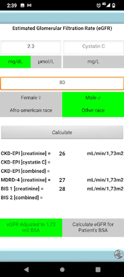 Calculators generally return the eGFR for a person with a total body surface area (BSA) of 1.73 m2. "Real eGFR" also allows to know the “real” GFR of the patient, that is, adjusted to their own BSA.