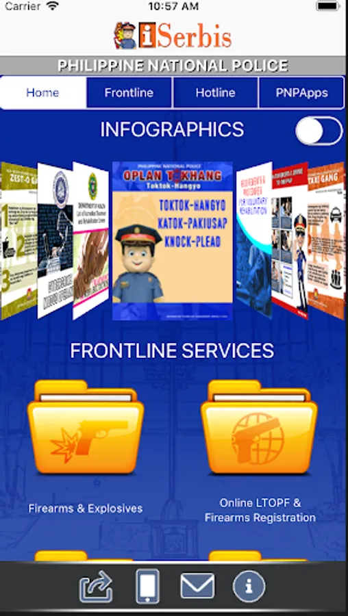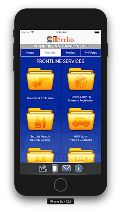 PNP iSerbis is an android-based mobile application that can be used by the public for inquiries regarding the frontline services offered by PNP. This application contains consolidated step-by-step procedures and requirements of the frontline services including: