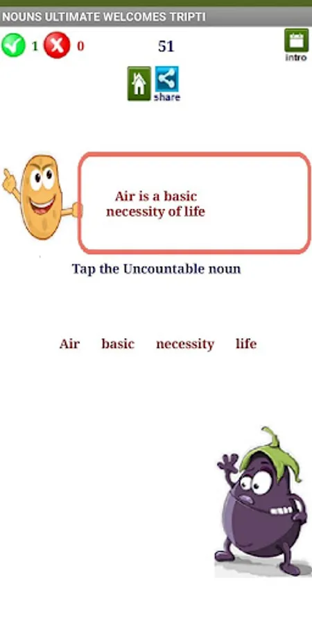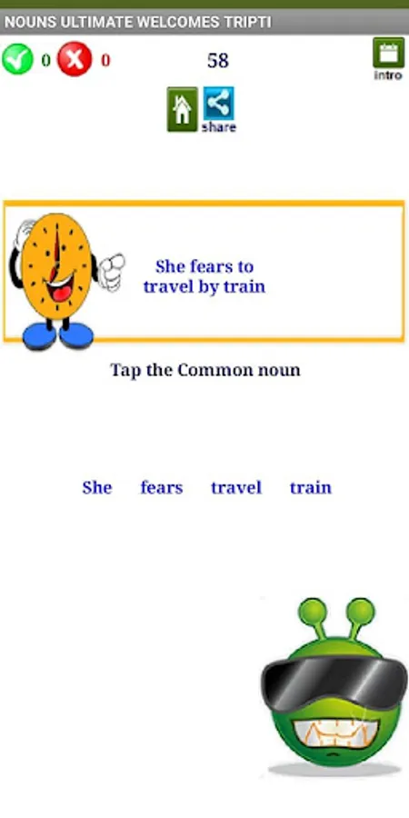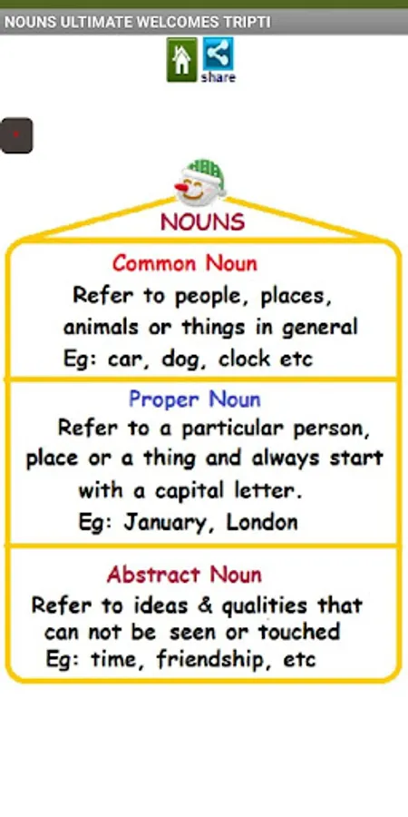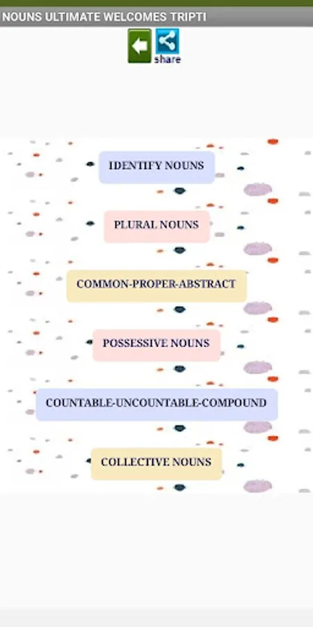 A complete course to master all kinds of nouns like Identify nouns, Singular-Plural noun, Common noun, Proper noun, Abstract noun, Possessive noun, Countable noun, Uncountable noun, Compound noun and Collective noun. It contains many quizzes with over 100 questions in each quiz and themed stickers which is the main attraction. The share button on each page lets you share that page with your friends on social medial because of which you can also share your score.