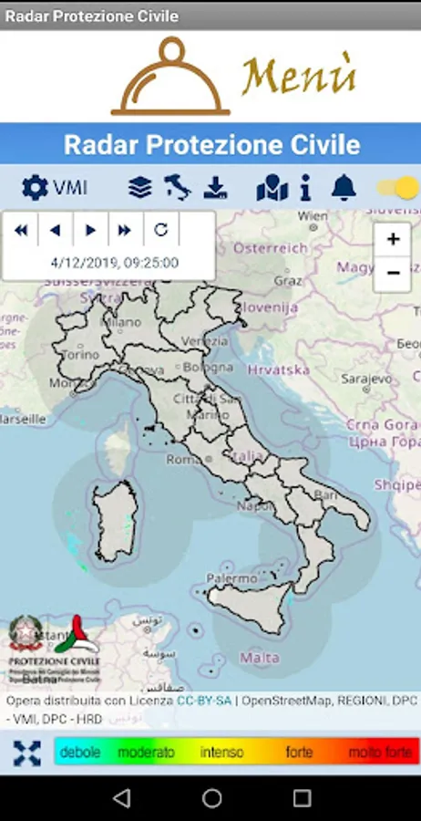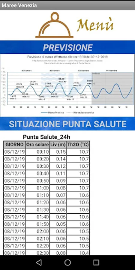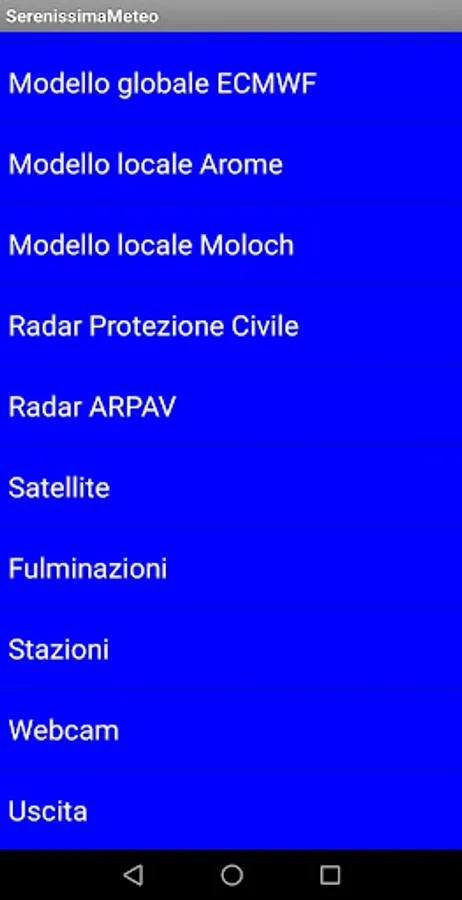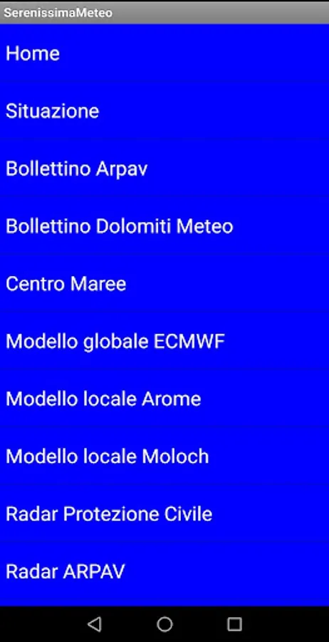 The app contains a plurality of meteorological monitoring and forecasting services, usually available on various apps or accessible only via the web. These are both global and specific services for the Veneto region, to which the app is addressed. To all these services is added an experimental forecasting service dedicated to the Veneto region and obtained with a post-processing of data freely available on the web.