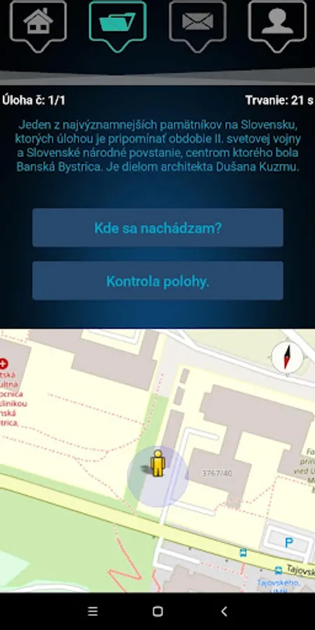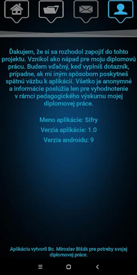 The Cipher application was created as a practical part of the diploma thesis. It contains mathematical-logical tasks that the participant solves at some of the cultural, social and historical monuments in the town of Banská Bystrica. He will get to it after solving the clue. Everything is done through databases, from which the application draws data and also sends them, so it is necessary to connect to the Internet using mobile data. There is also a questionnaire in the application, with which the user can express feedback in an anonymous manner.