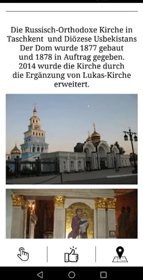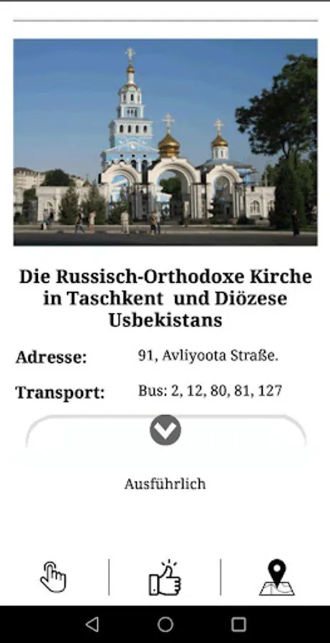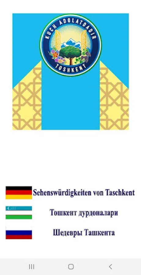 Die mobile App „Sehenswürdigkeiten von Taschkent“ (Handbuch) wurde von der Usbekisch-Deutschen Freundschaftsgesellschaft im Rahmen einer finanziellen Unterstützung der Öffentlichen Stiftung zur Förderung nichtstaatlicher gemeinnütziger Organisationen und anderer zivilgesellschaftlicher Institutionen bei Oliy Majlis der Republik Usbekistan entwickelt. Die folgenden Personen haben an dem Projekt mitgewirkt: G. A. Astashova, I. A. Shchur, M. F. Flimova, M. Z. Abdullaeva, G. S. Saidmavlonova, M. Yu. Abdulakhadova, N. M. Patulloev