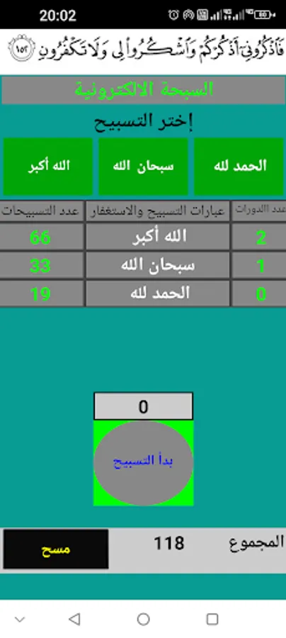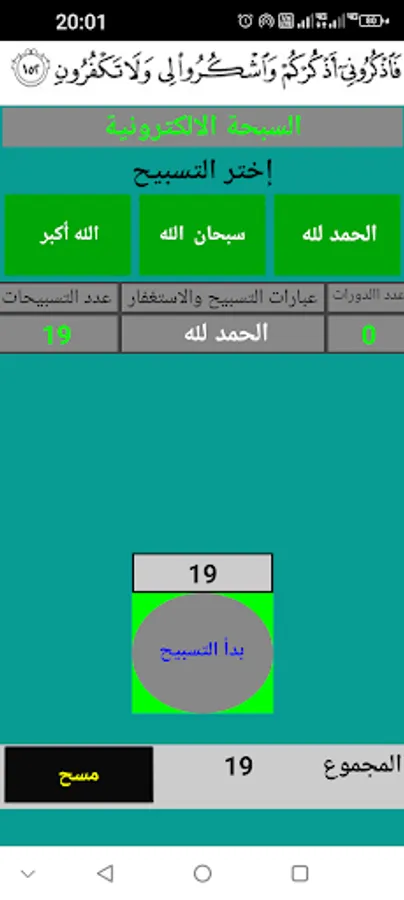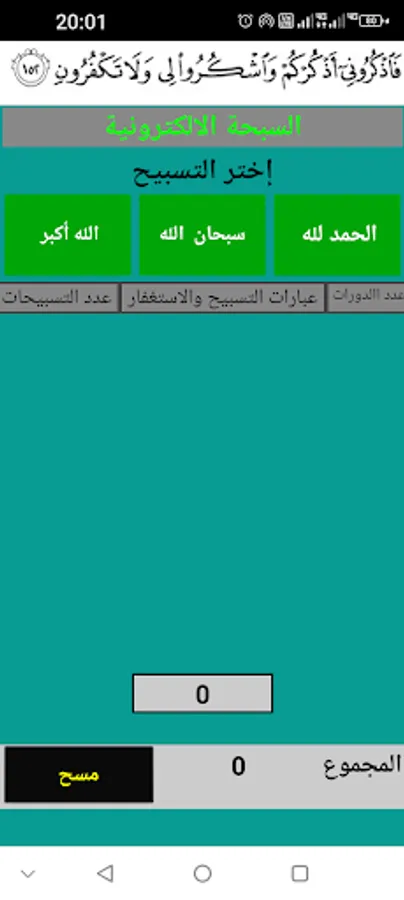 تطبيق السبحة الالكترونية بسيط وسهل الاستخدام يمكنك من إختيار التسبيح المرغوب وحساب عددالتسبيحات لكل تسبيح وعددالدورات لكل تسبيح وكدالك المجموع الاجمالي كما يدكرك عندا نهايت كل دورة